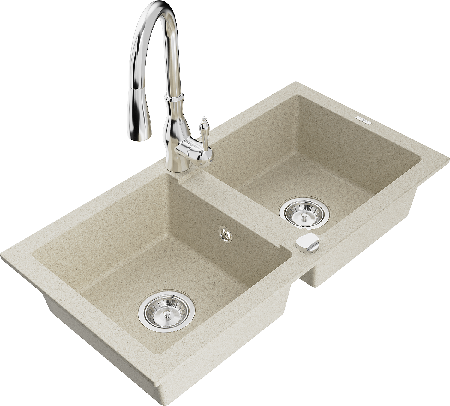 Mexen Mario chiuvetă de bucătărie din granit cu 2 compartimente și baterie de bucătărie Savita, bej - 6504-69-672601-00