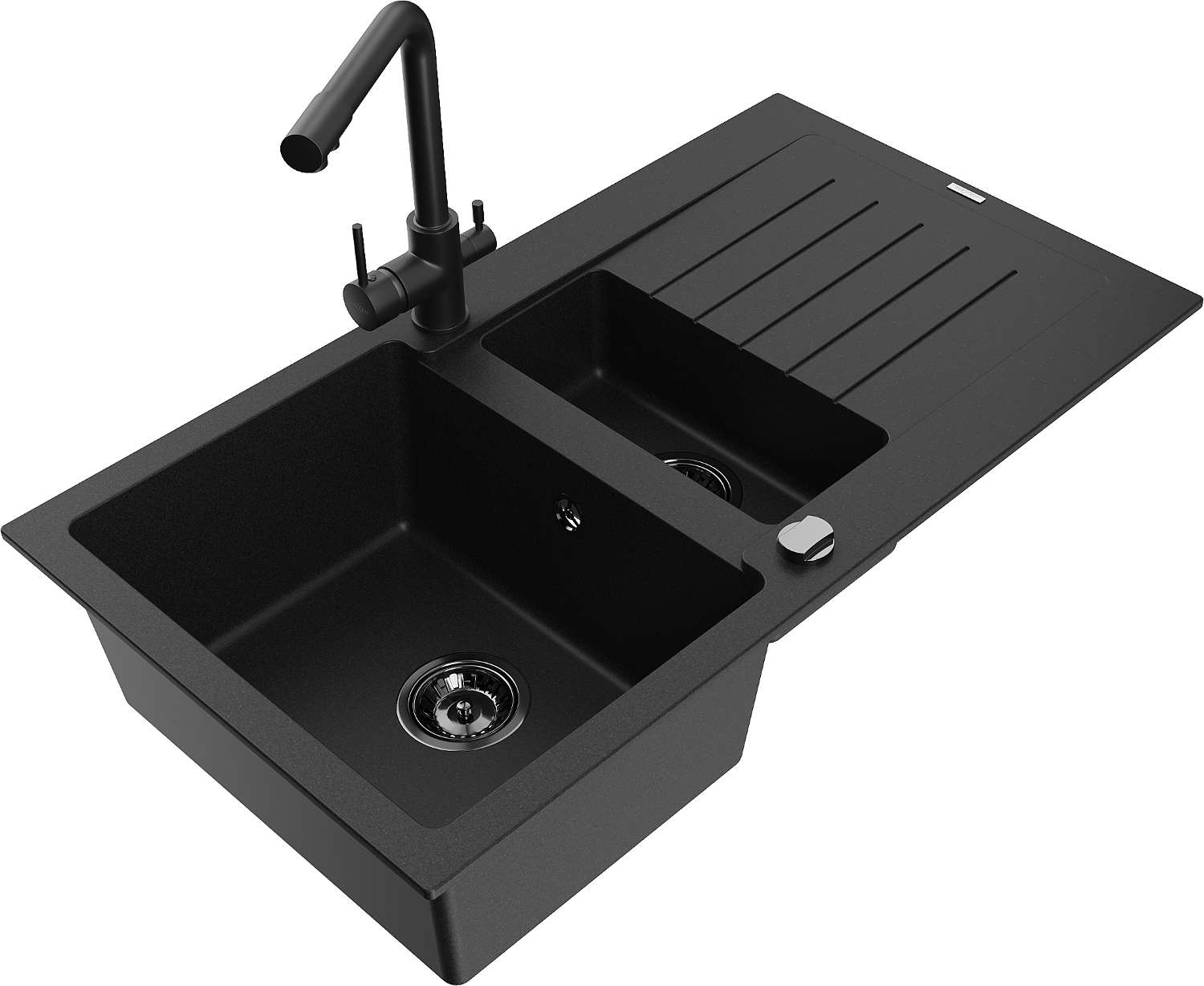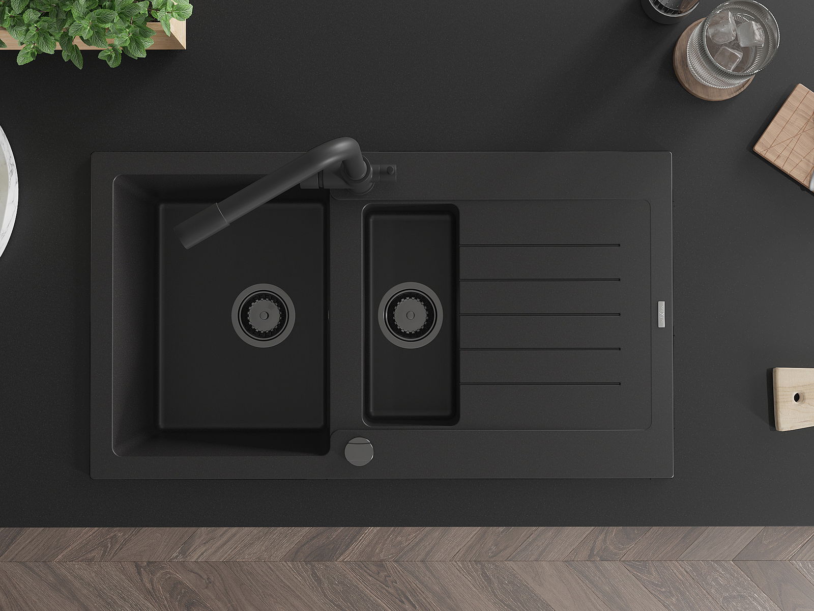 Mexen Matias chiuvetă de granit cu 1,5 compartimente cu scurgător și baterie de bucătărie Duero, negru - 6502-77-671600-70-B