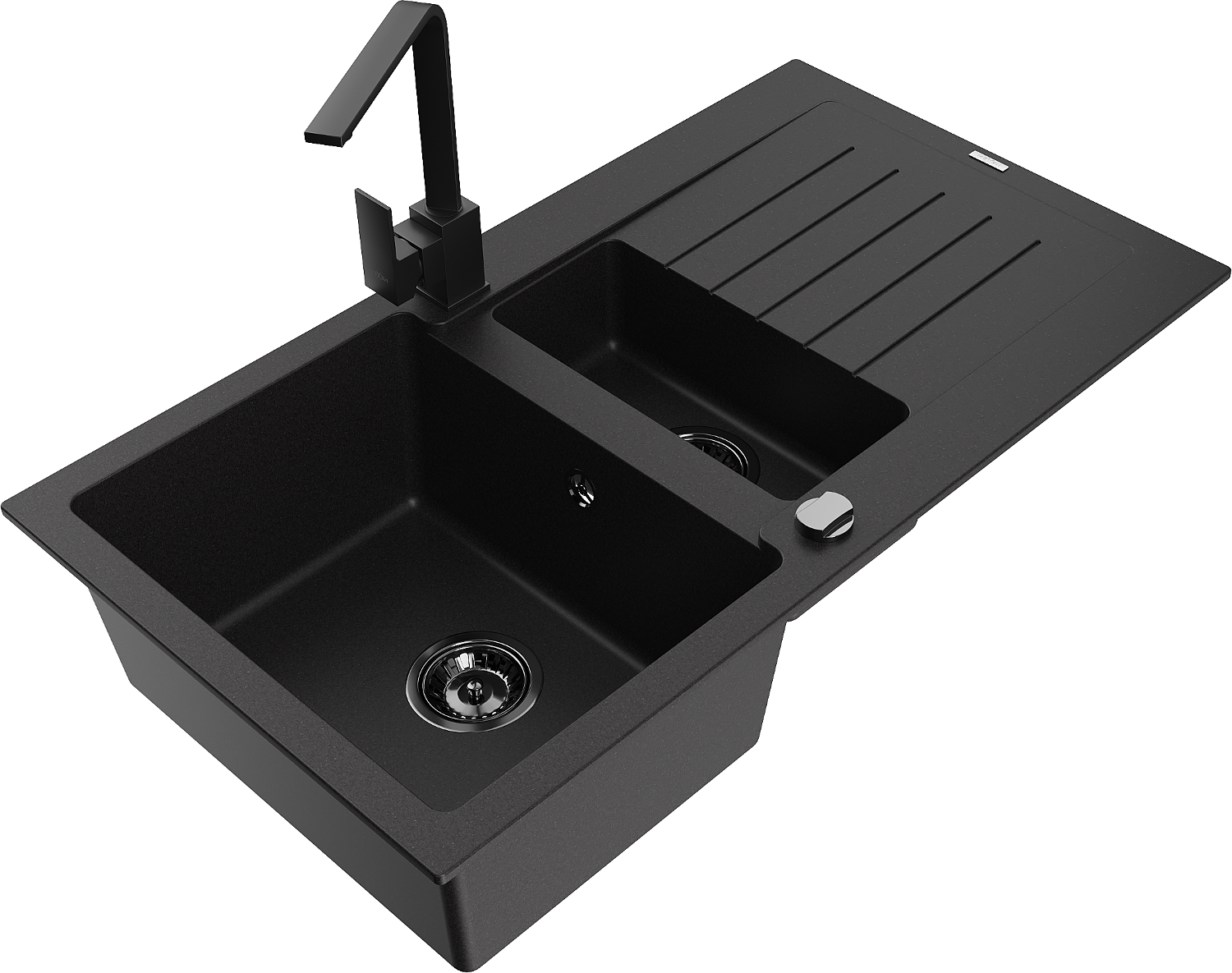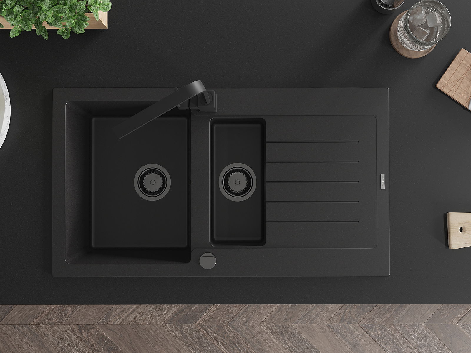 Mexen Matias chiuvetă de granit 1,5 camere cu scurgător și baterie de bucătărie Rita, negru - 6502-77-670300-70-B