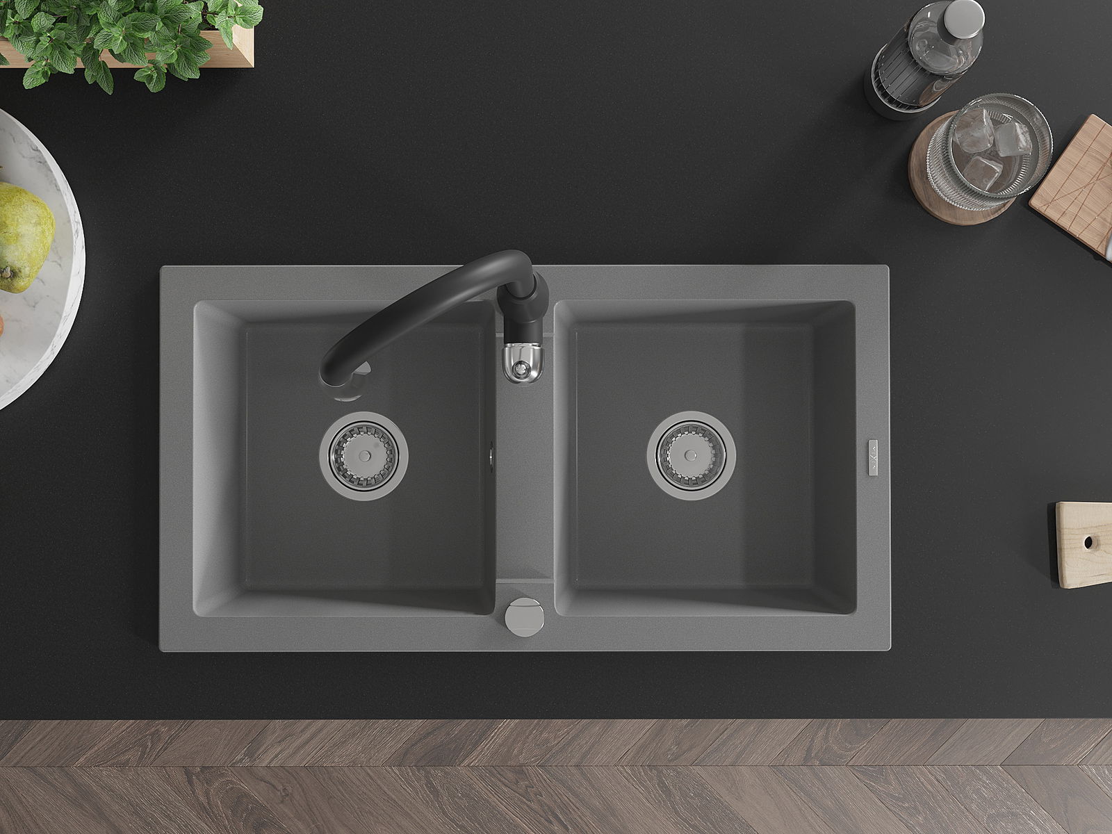 Mexen Mario chiuvetă granit 2-camere cu baterie de bucătărie Savita, gri - 6504-71-672601-70