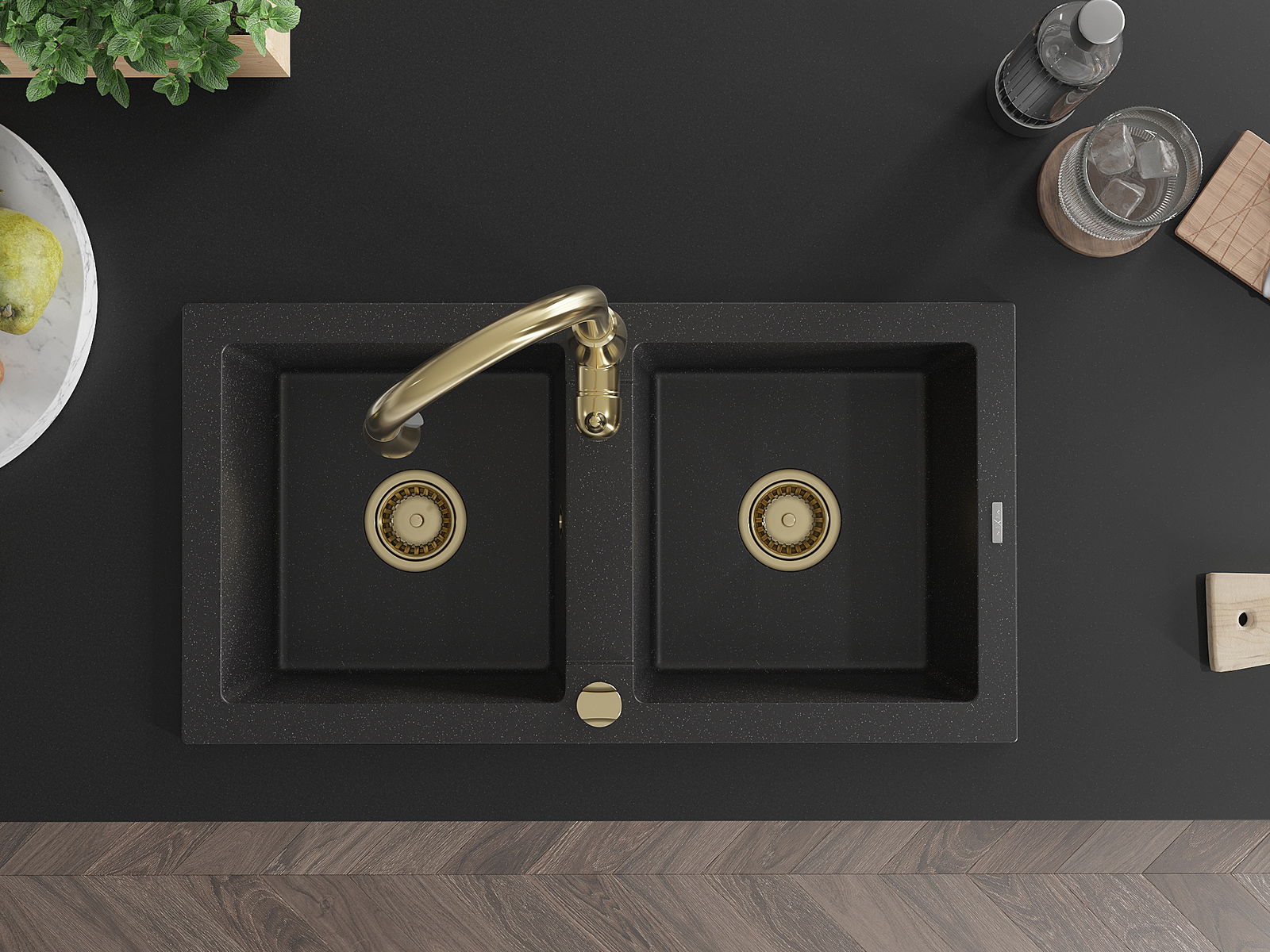 Mexen Mario chiuvetă de granit cu 2 compartimente cu baterie de bucătărie Savita, negru/argintiu metalic - 6504-73-672601-50