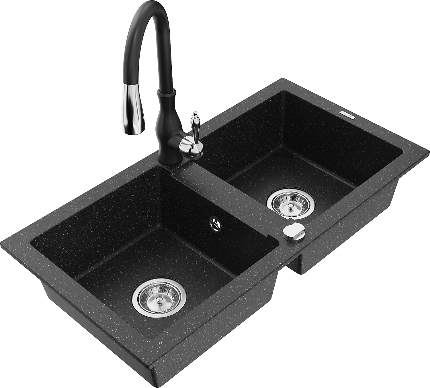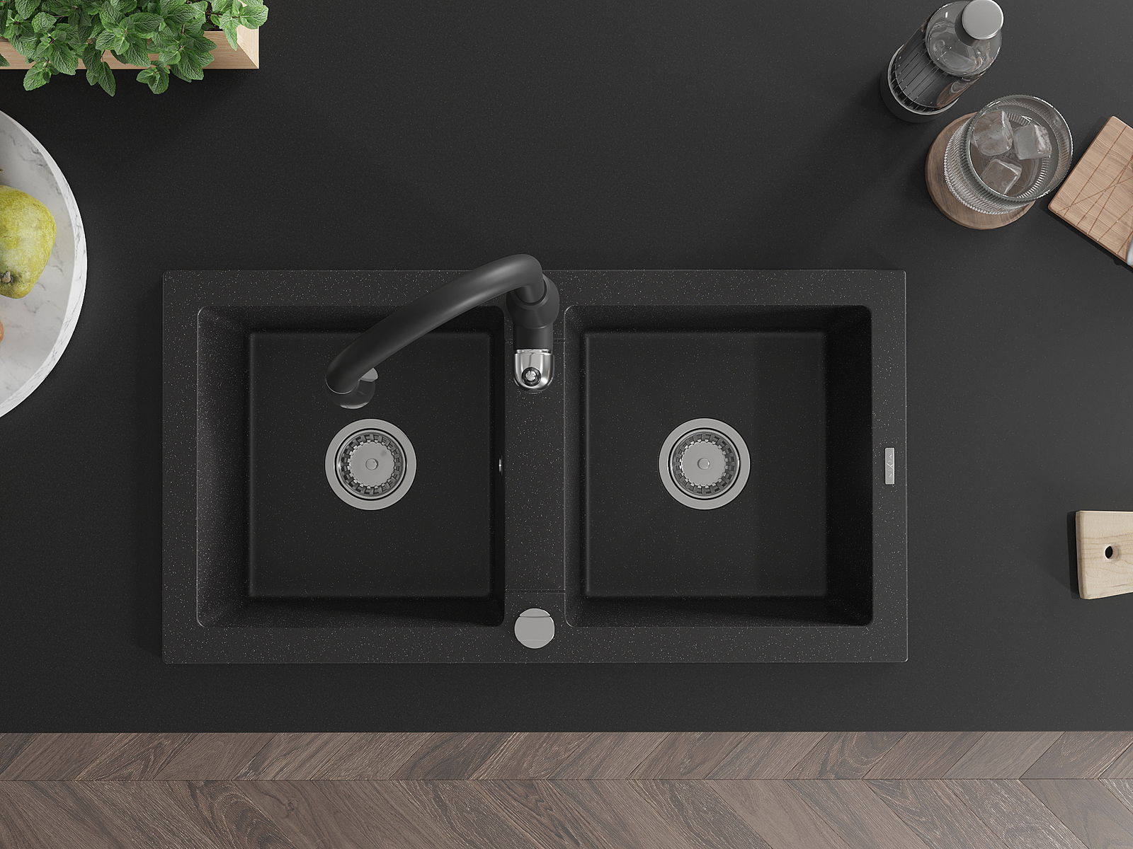 Mexen Mario chiuvetă din granit cu 2 compartimente și baterie de bucătărie Savita, negru/argintiu metalizat - 6504-73-672601-70