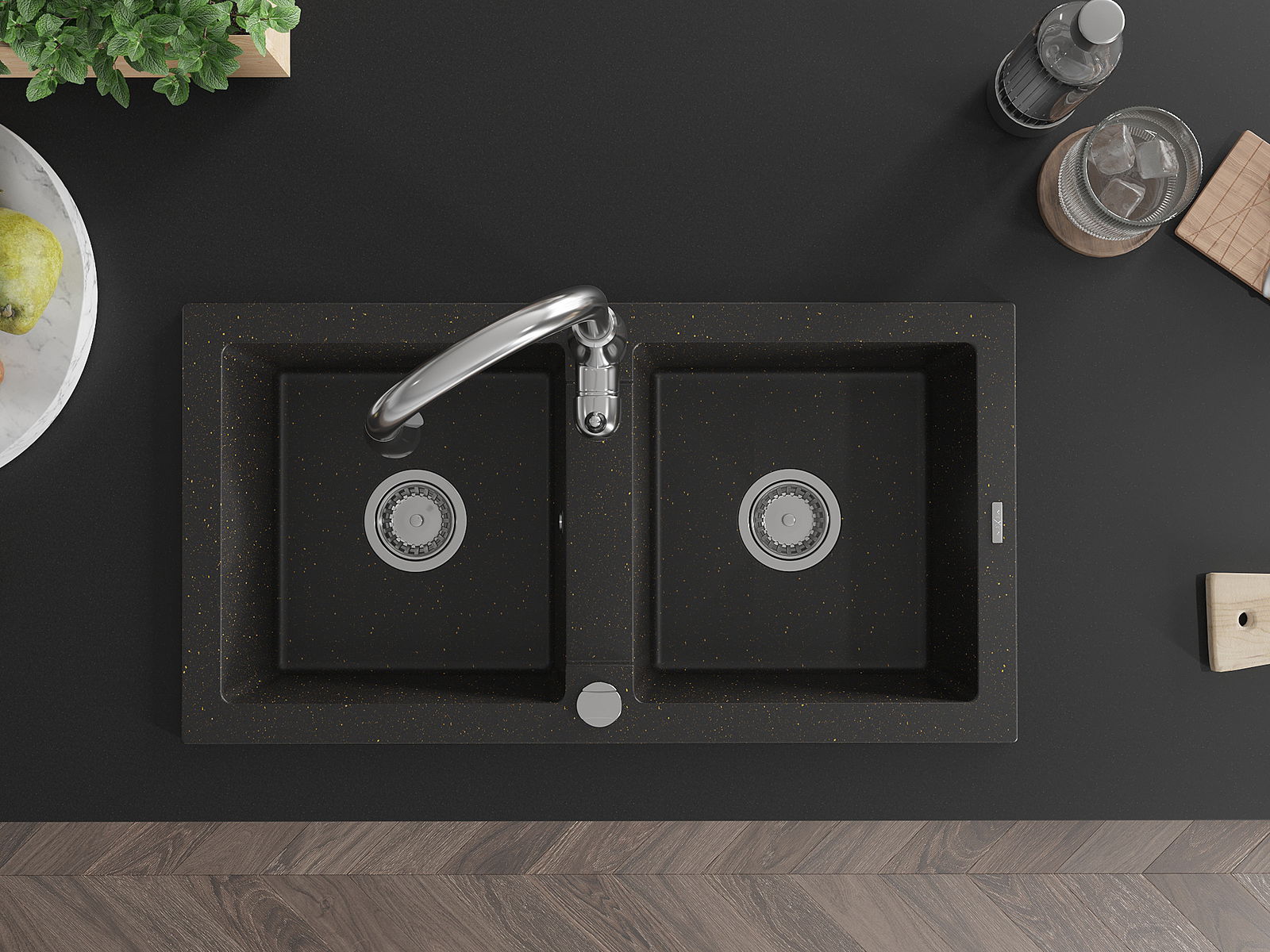 Mexen Mario chiuvetă granit 2-camere cu baterie de bucătărie Savita, negru/auriu metalic - 6504-75-672601-00