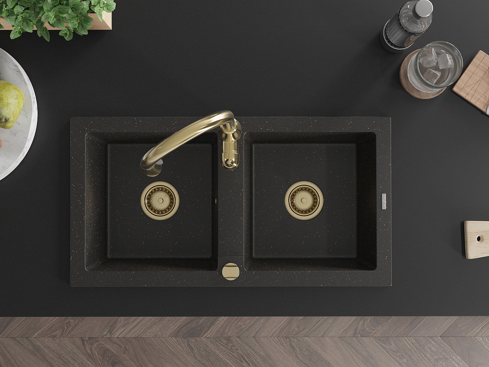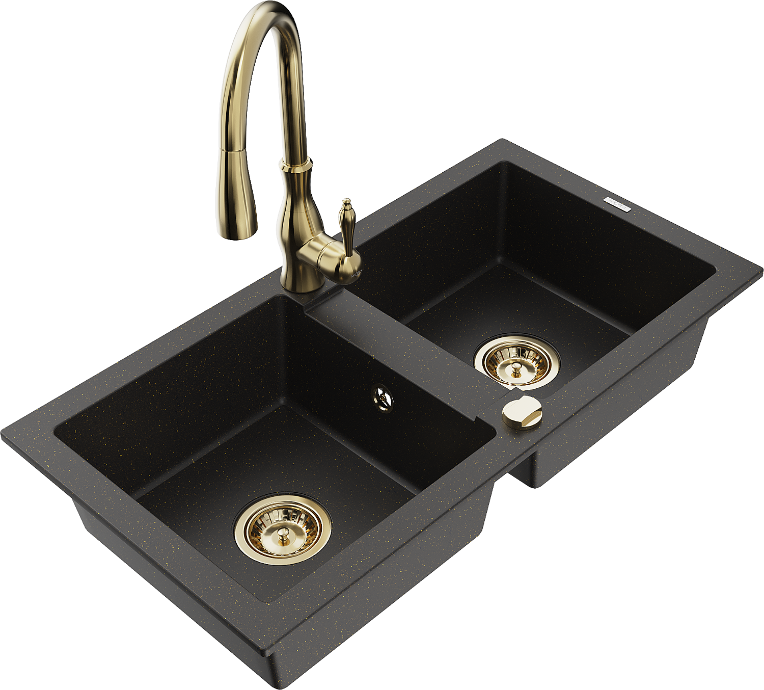 Mexen Mario chiuvetă granit dublă cu baterie de bucătărie Savita, negru/auriu metalic - 6504-75-672601-50