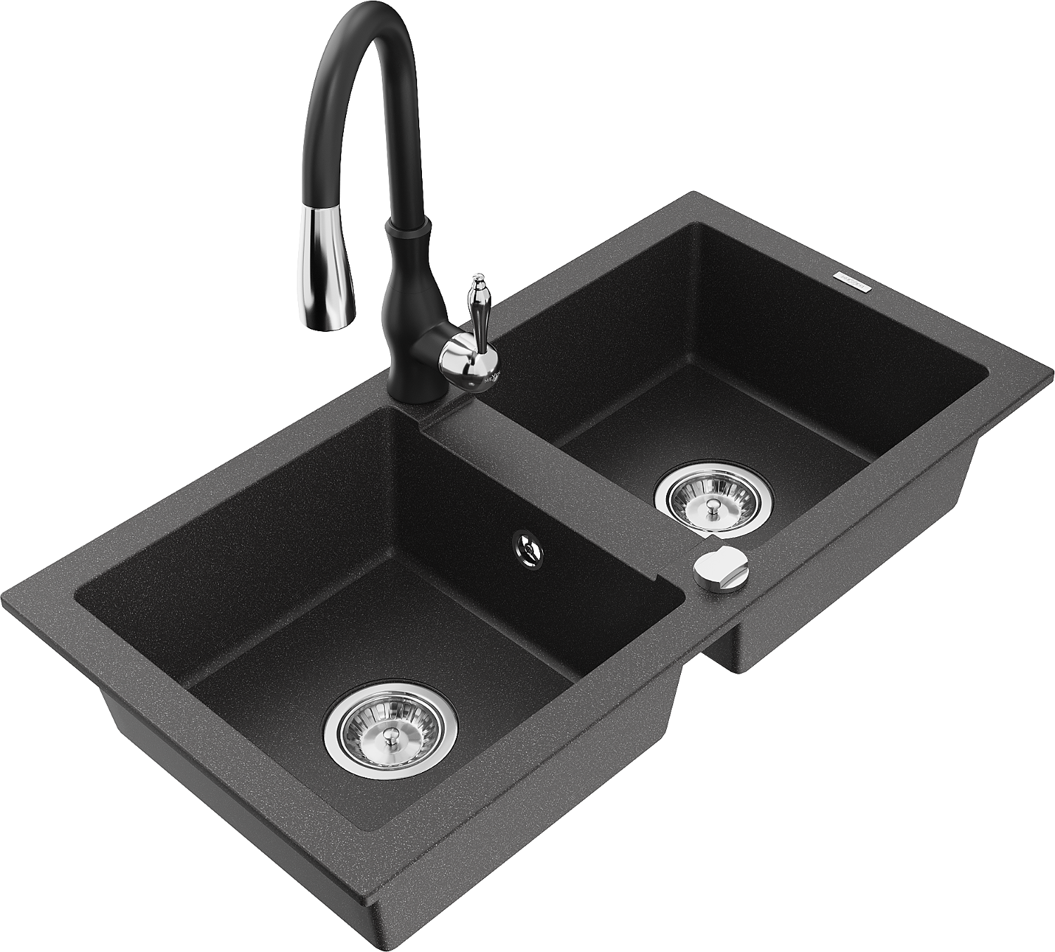 Mexen Mario chiuvetă de bucătărie din granit cu 2 compartimente cu baterie Savita, negru presărat - 6504-76-672601-70