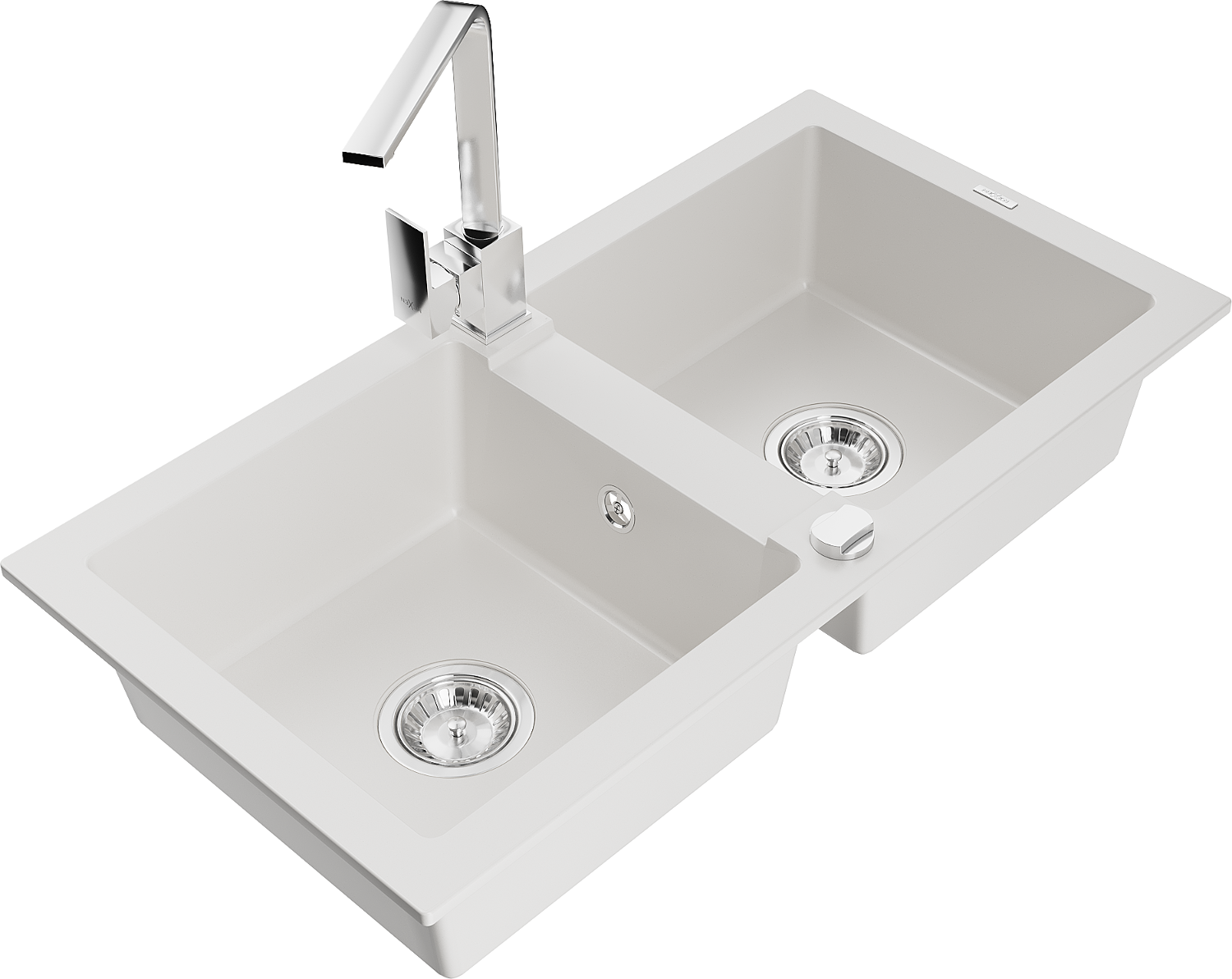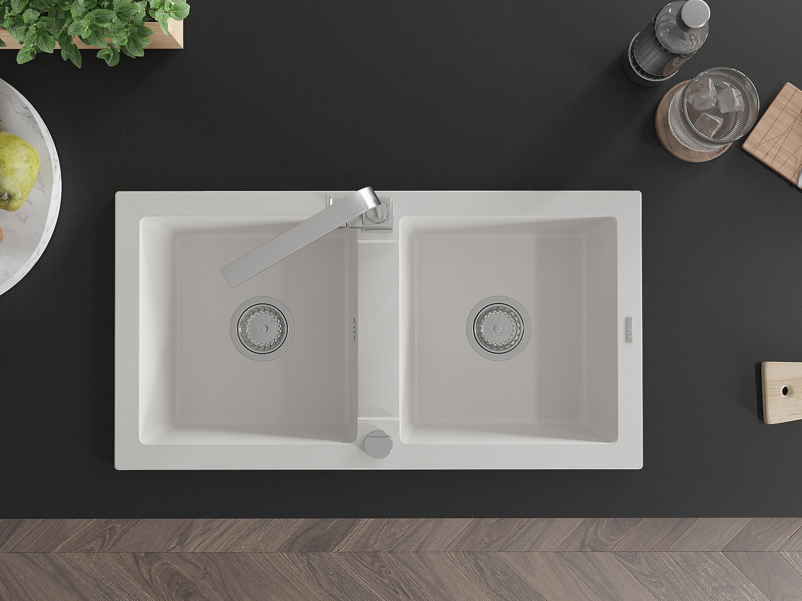 Mexen Mario chiuvetă de bucătărie din granit cu 2 compartimente și baterie de bucătărie Rita, alb - 6504-20-670300-00