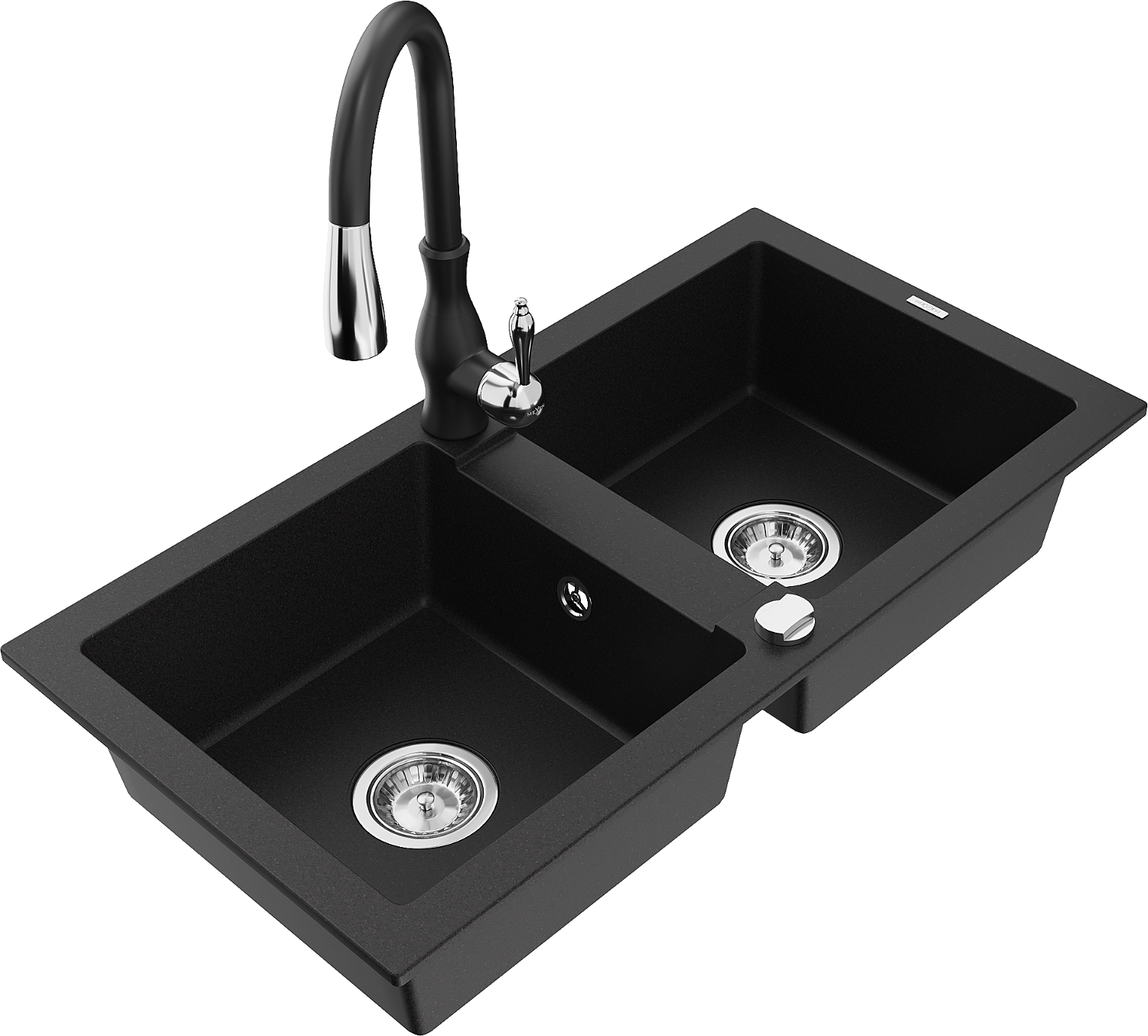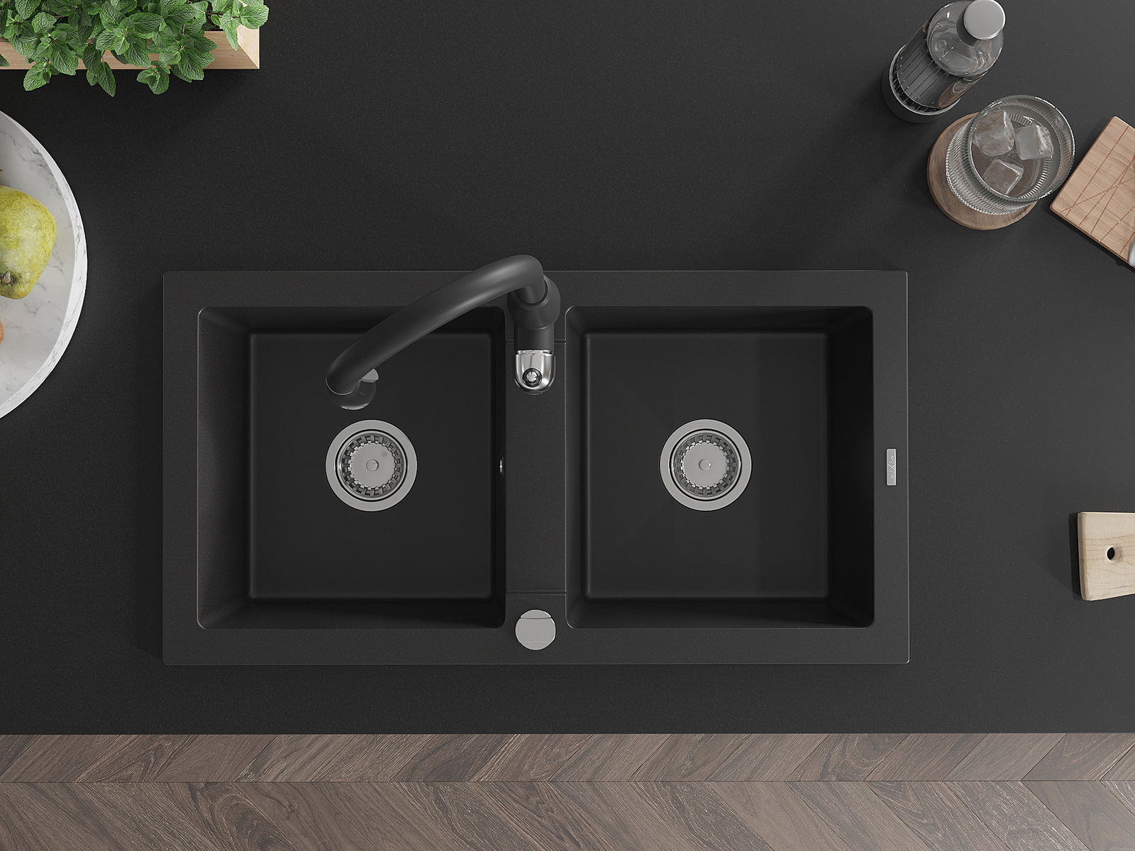 Mexen Mario chiuvetă de bucătărie din granit cu 2 compartimente și baterie de bucătărie Savita, negru - 6504-77-672601-70