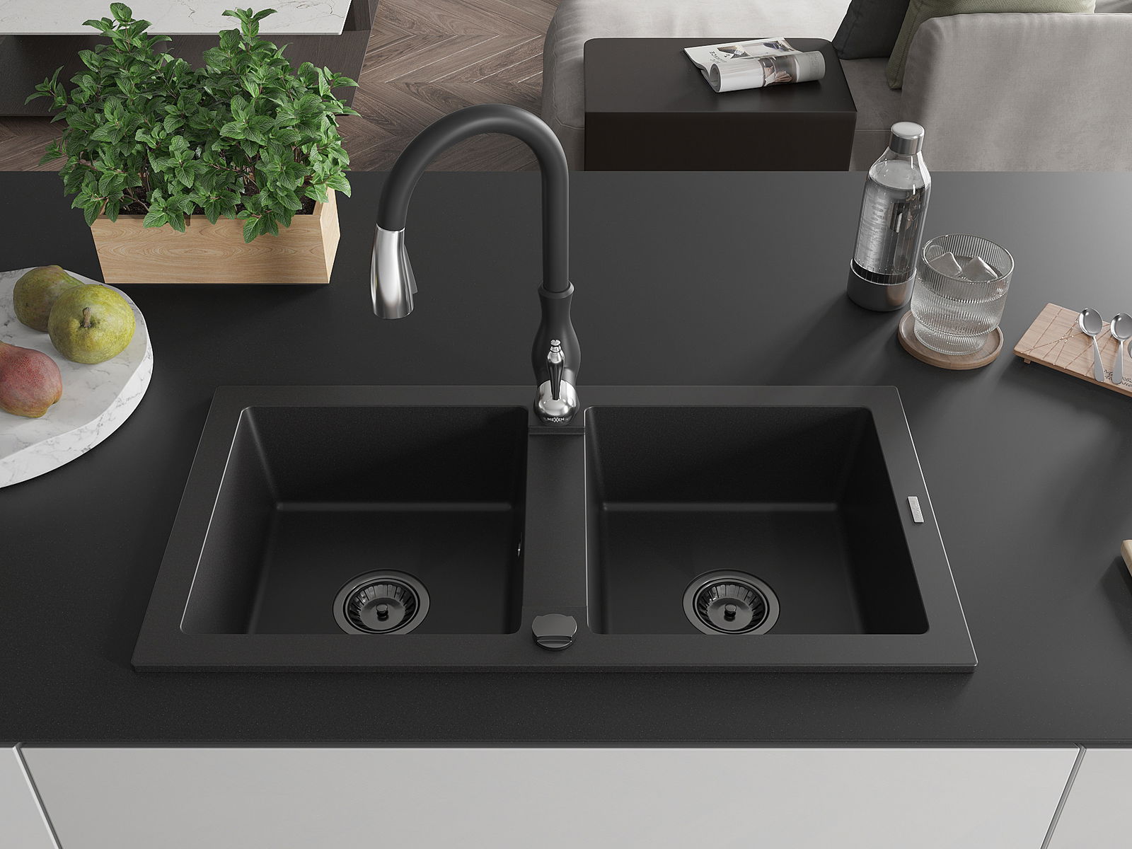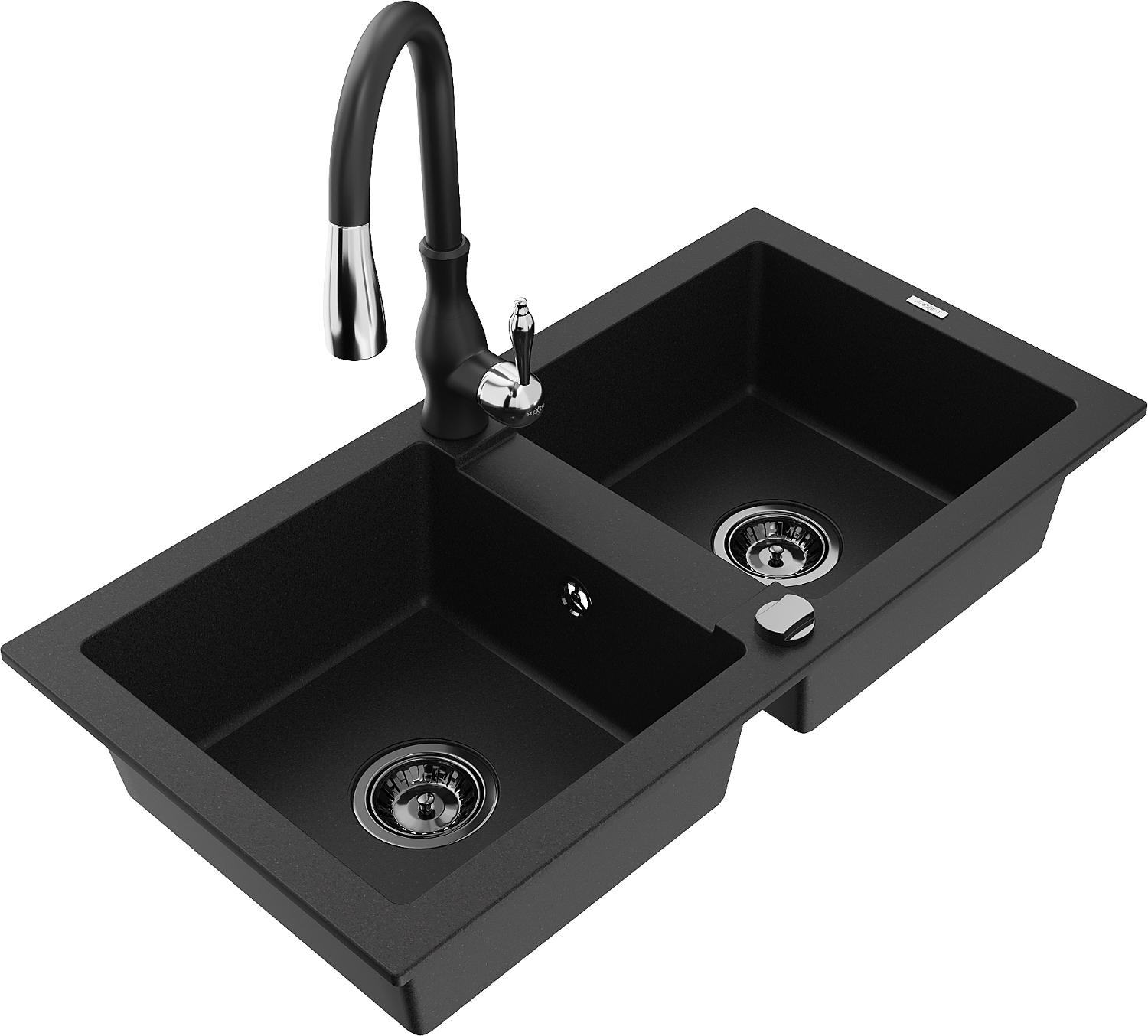 Mexen Mario chiuvetă granit 2-cupe cu baterie de bucătărie Savita, negru - 6504-77-672601-70-B