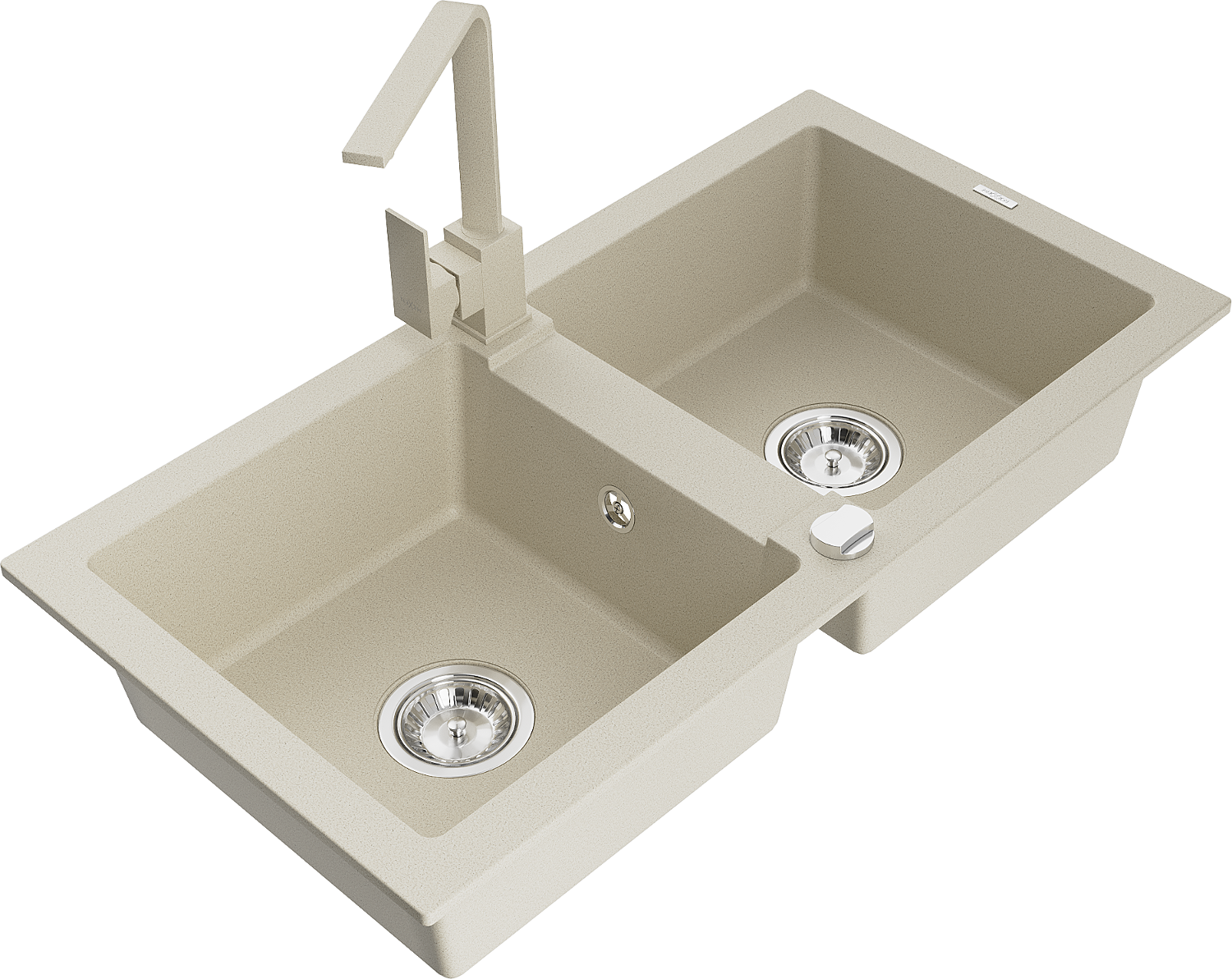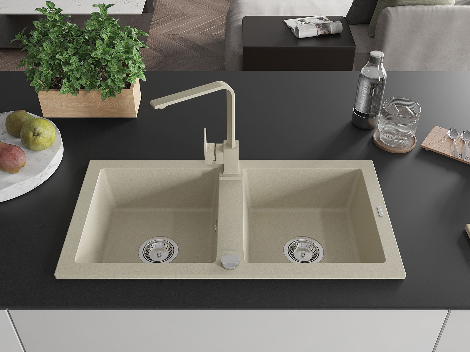 Mexen Mario chiuvetă din granit cu 2 compartimente și baterie de bucătărie Rita, bej - 6504-69-670300-69