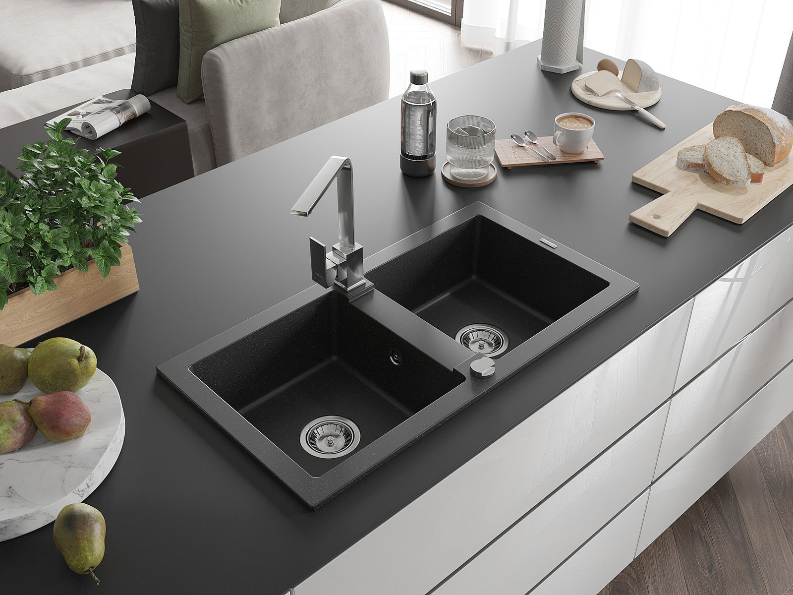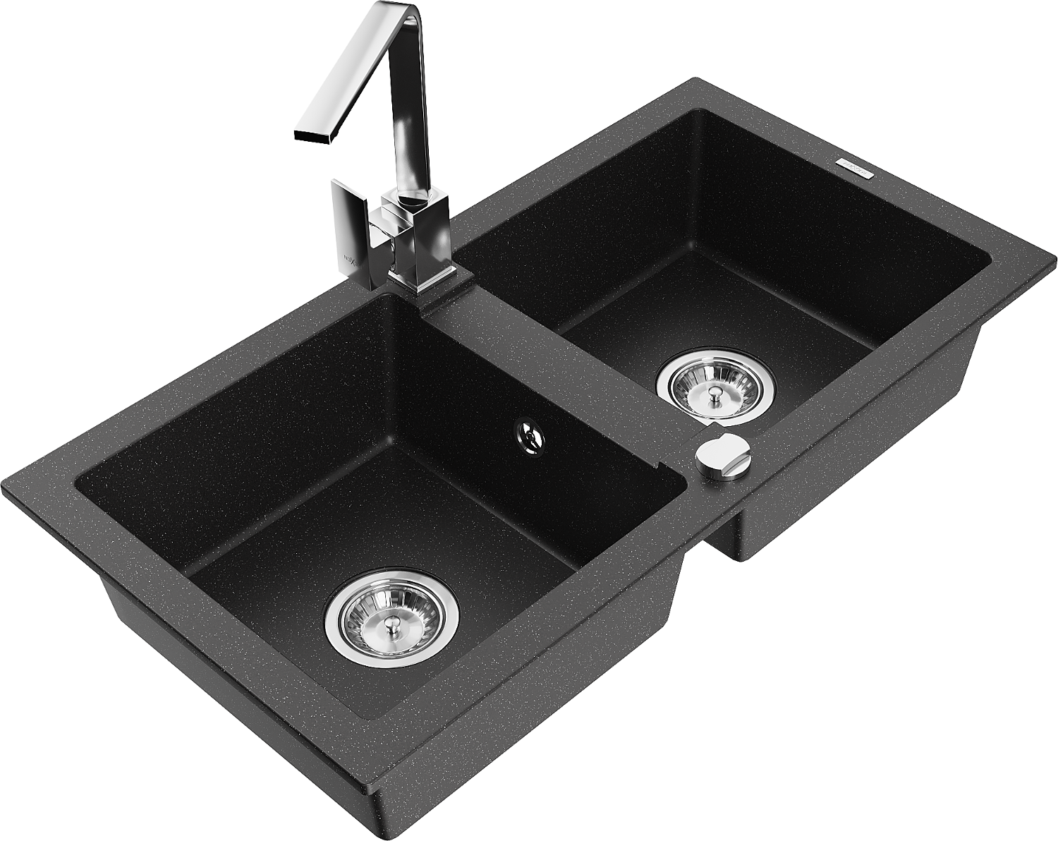 Chiuvetă de granit Mexen Mario cu 2 compartimente și baterie de bucătărie Rita, negru/argintiu metalizat - 6504-73-670300-00