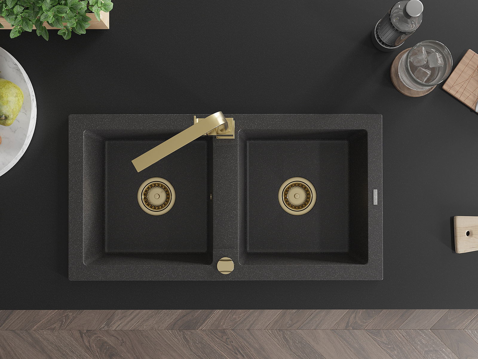 Mexen Mario chiuvetă de granit cu 2 compartimente cu robinet de bucătărie Rita, negru cu picățele - 6504-76-670300-50