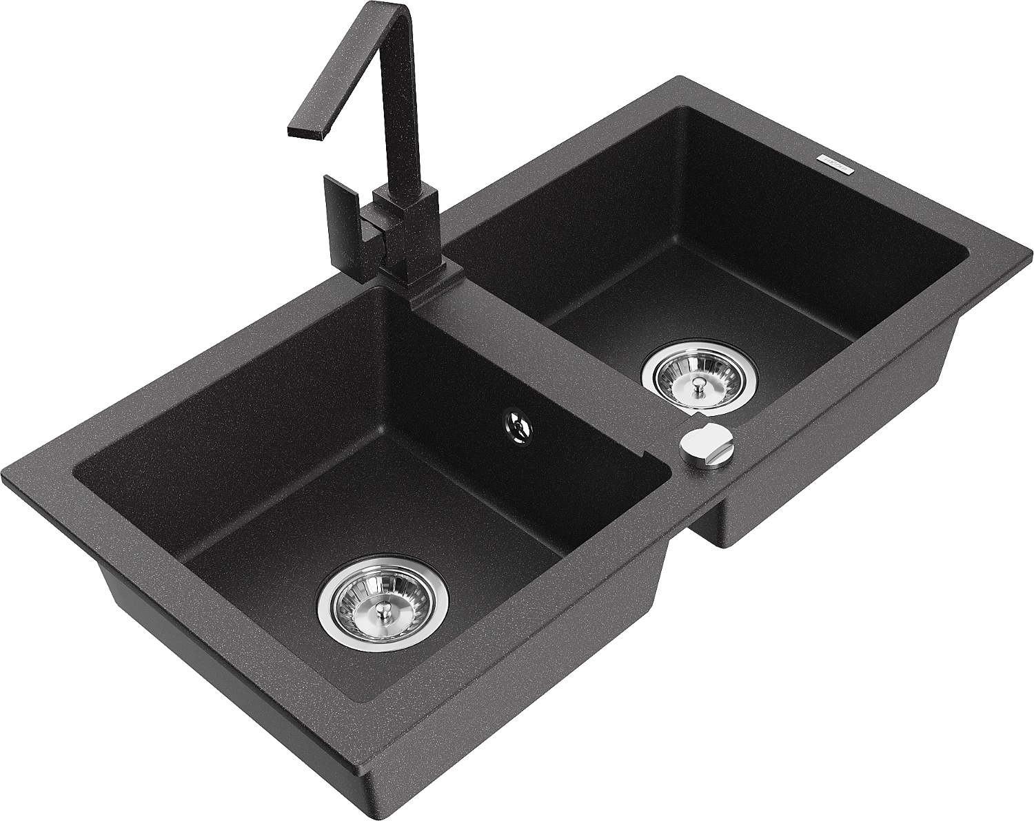 Mexen Mario chiuvetă din granit cu 2 compartimente și baterie de bucătărie Rita, negru pătat - 6504-76-670300-76