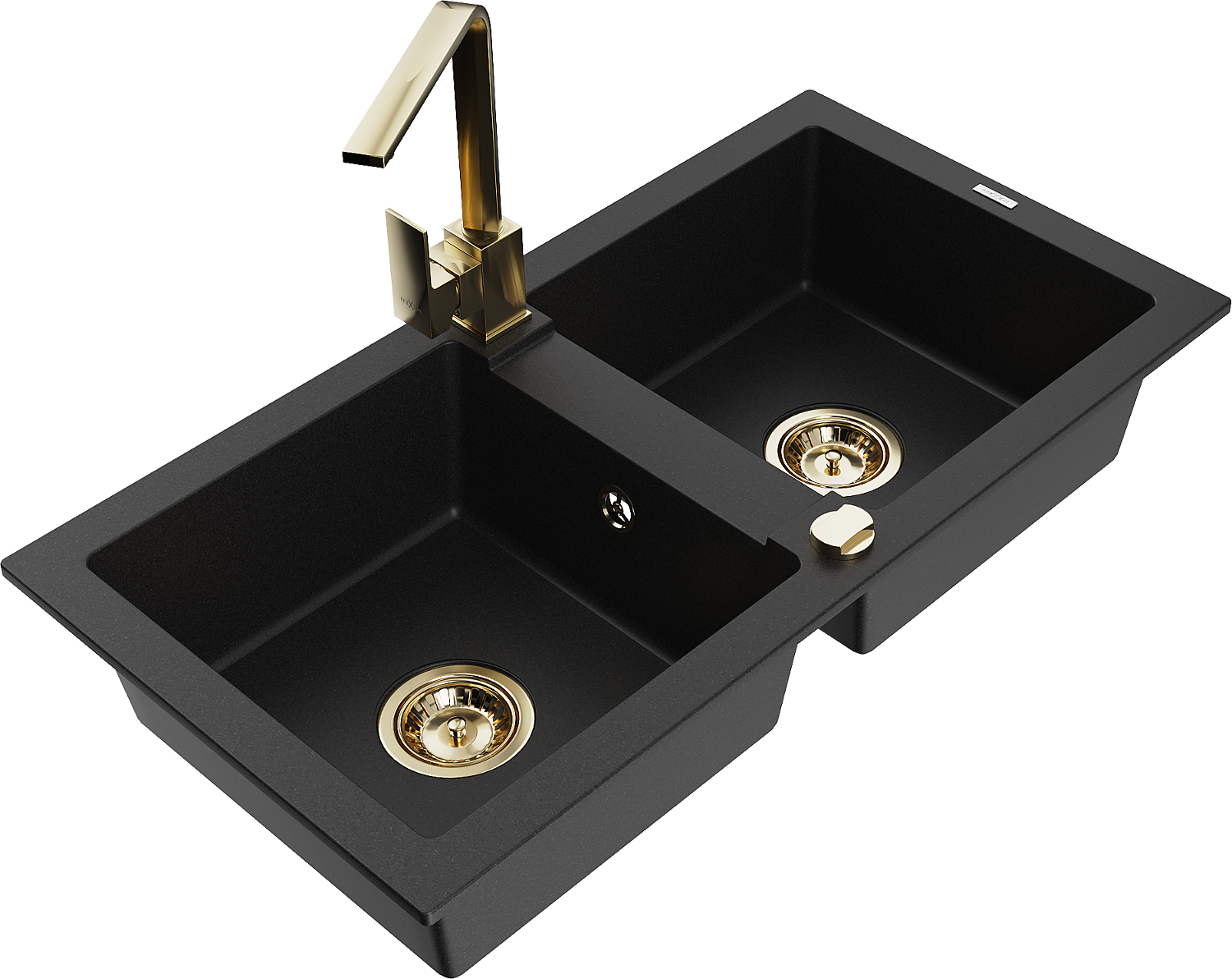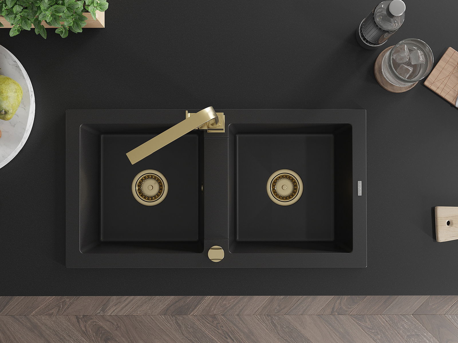 Mexen Mario chiuvetă de bucătărie din granit cu 2 compartimente și baterie de bucătărie Rita, negru - 6504-77-670300-50