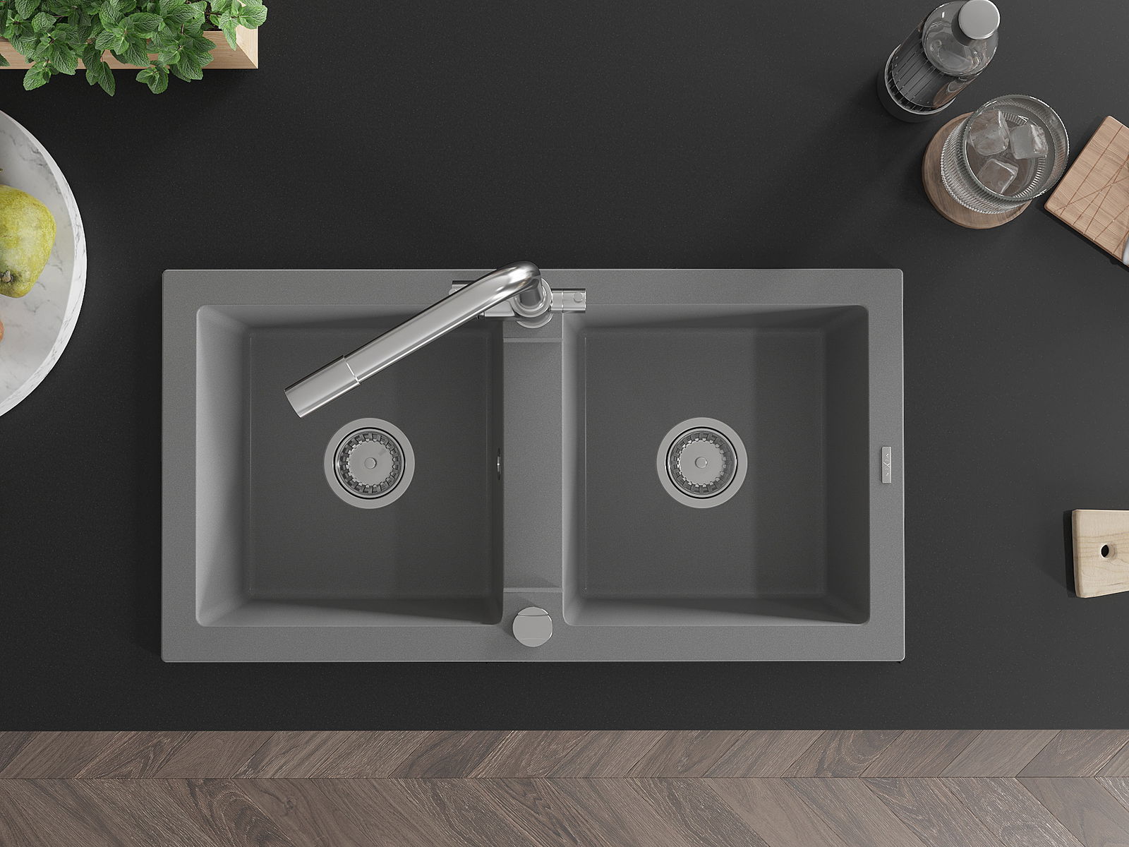 Mexen Mario chiuvetă de granit cu 2 compartimente cu baterie de bucătărie Duero, gri - 6504-71-671600-00