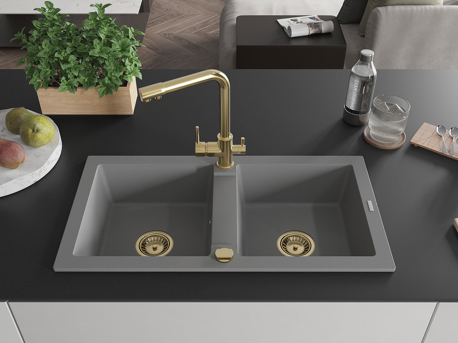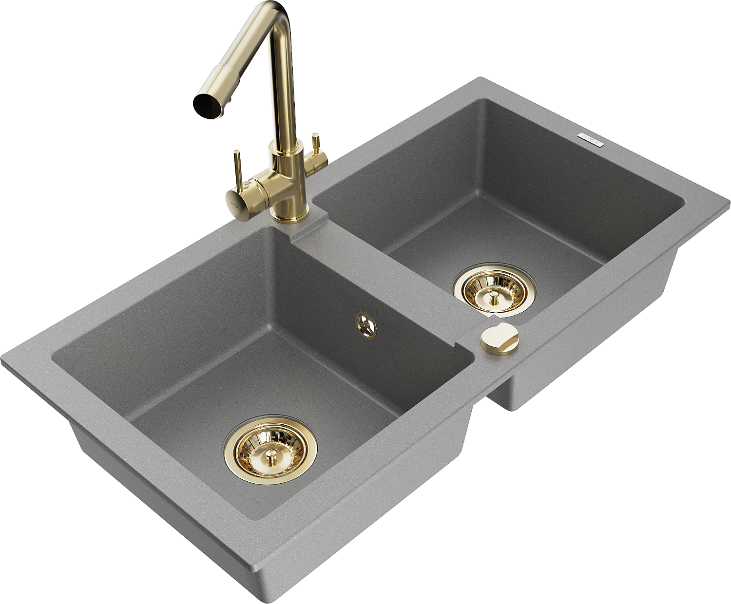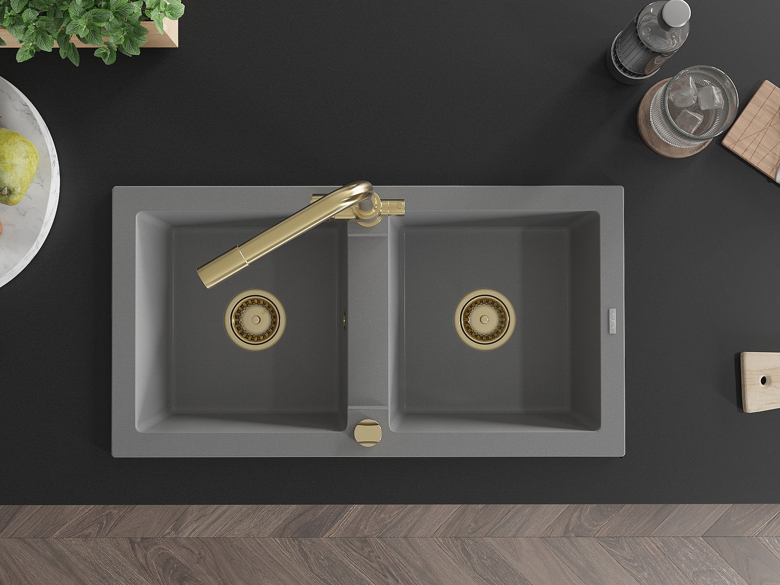Mexen Mario chiuvetă de bucătărie din granit cu 2 compartimente și baterie Duero, gri - 6504-71-671600-50