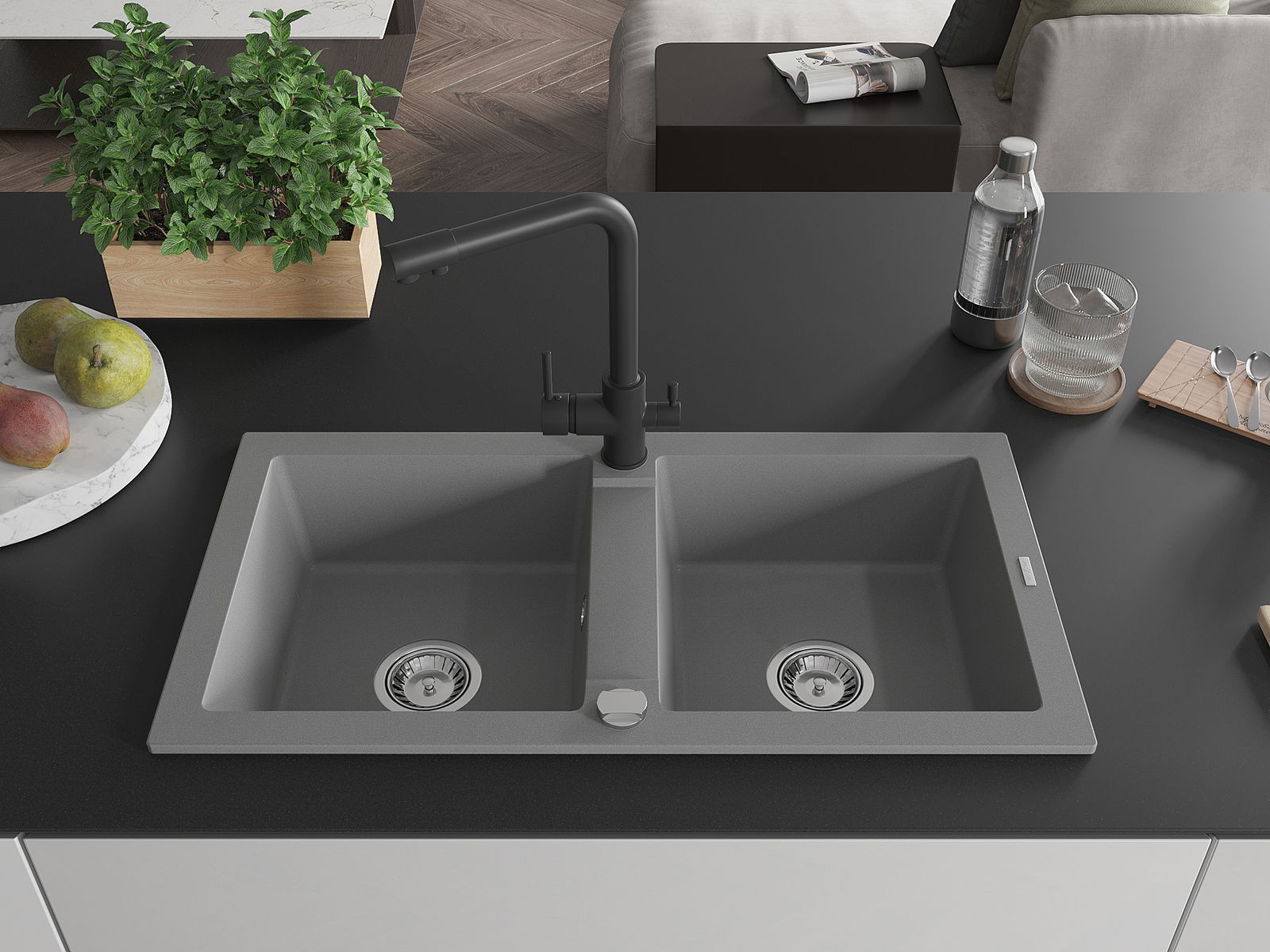Mexen Mario chiuvetă de bucătărie din granit cu 2 compartimente și baterie Duero, gri - 6504-71-671600-70