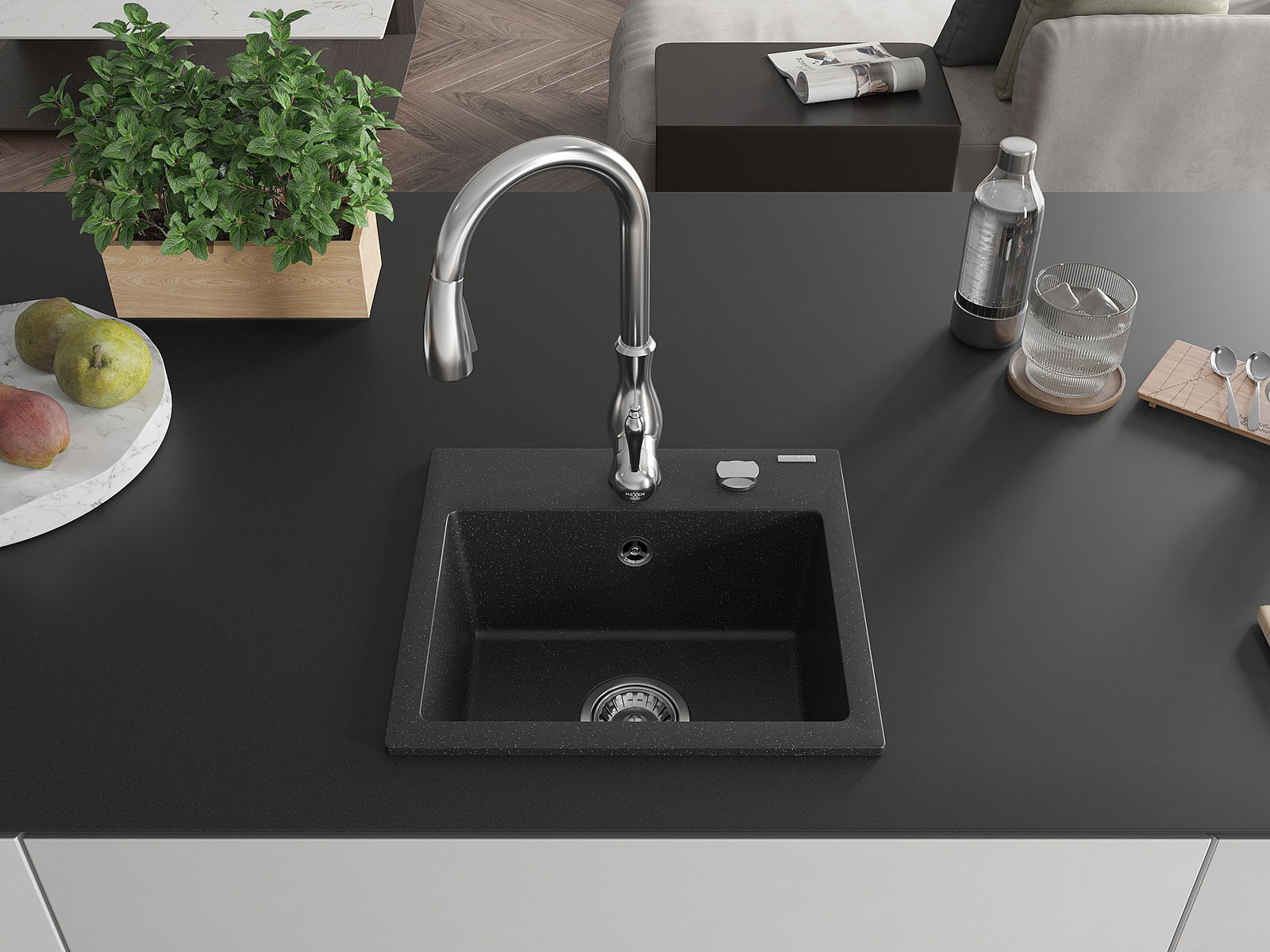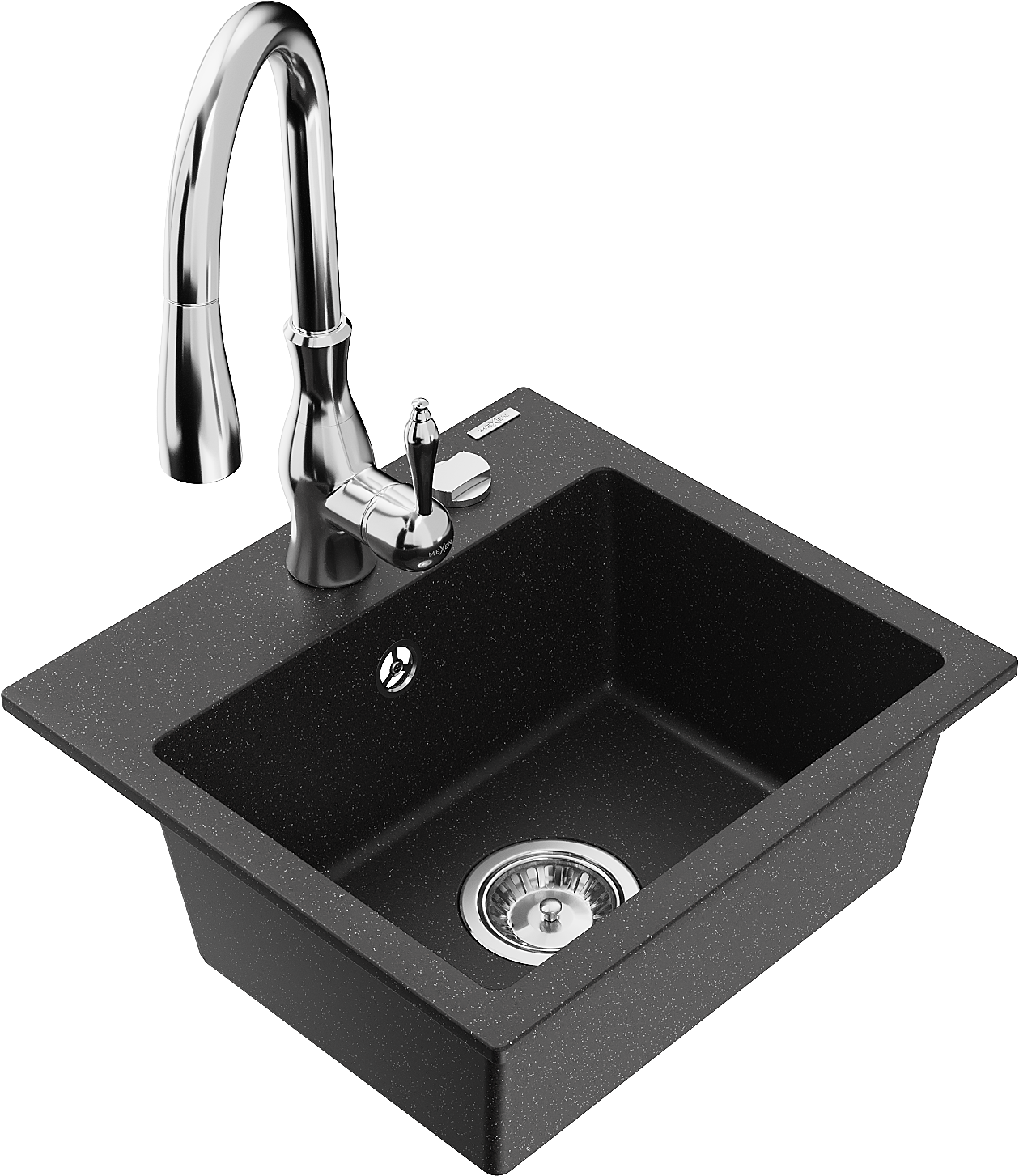 Mexen Milo chiuvetă de bucătărie din granit cu 1 cuvă și baterie de bucătărie Savita, negru/metalic argintiu- 6505-73-672601-00