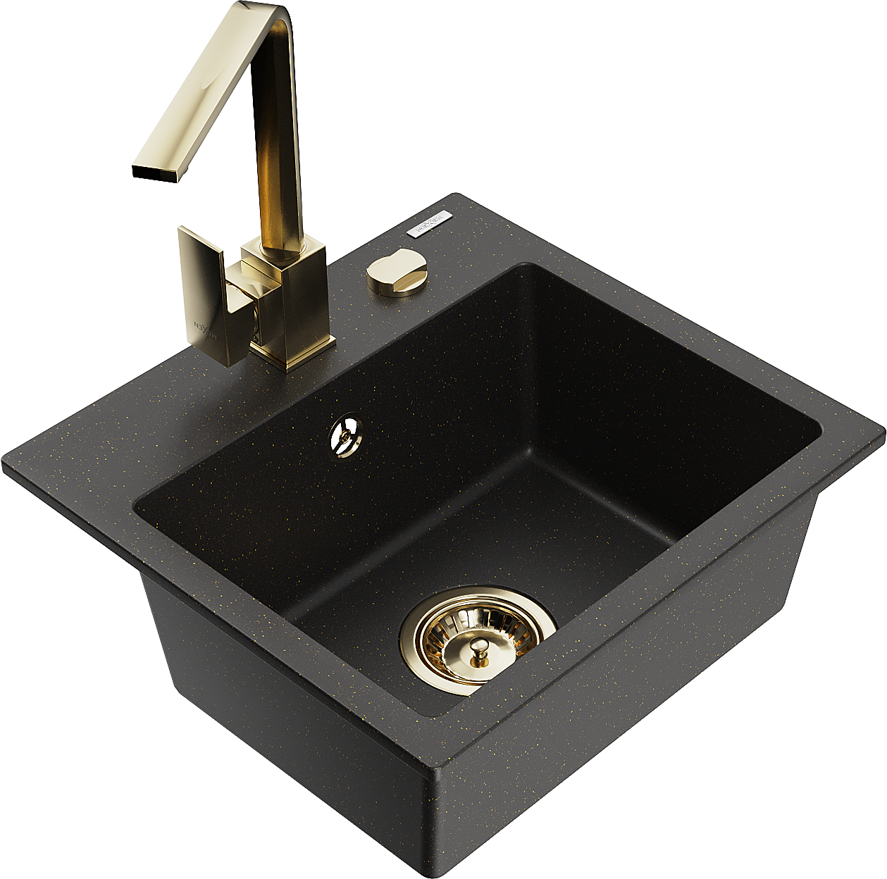 Mexen Milo chiuvetă din granit cu 1 compartiment și baterie de bucătărie Rita, negru/auriu metalic - 6505-75-670300-50