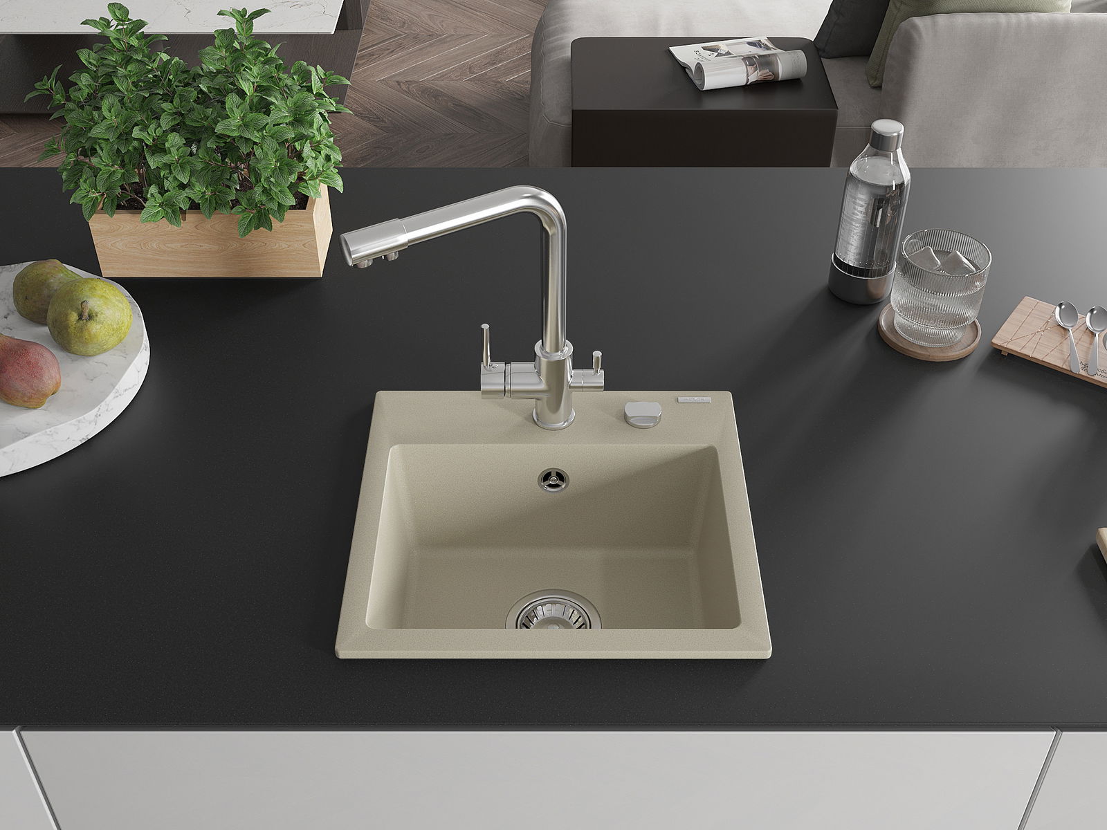Suprafața chiuvetei este rezistentă la pete și decolorare, ceea ce o face ușor de întreținut și își păstrează culoarea pentru o perioadă lungă de utilizare. Un complet estetic și practic pentru orice bucătărie.