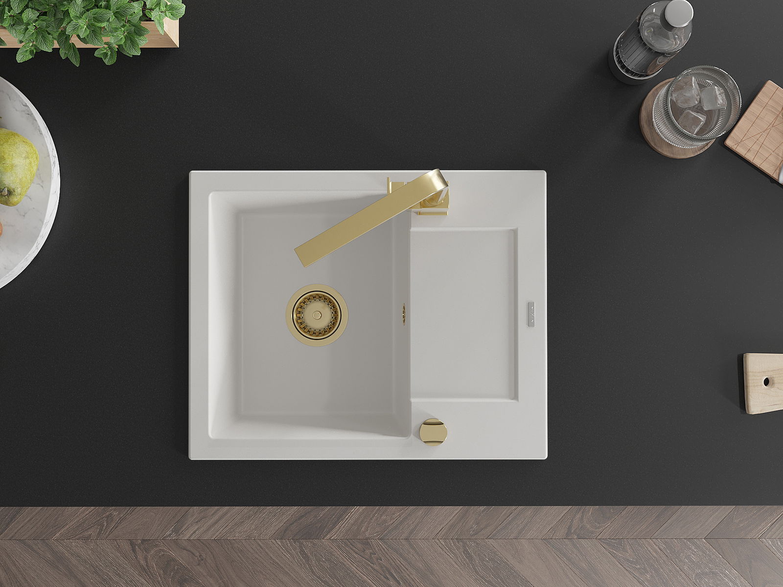 Mexen Enzo chiuvetă de granit cu o cuvă și scurgător, cu baterie de bucătărie Rita, albă - 6506-20-670300-50