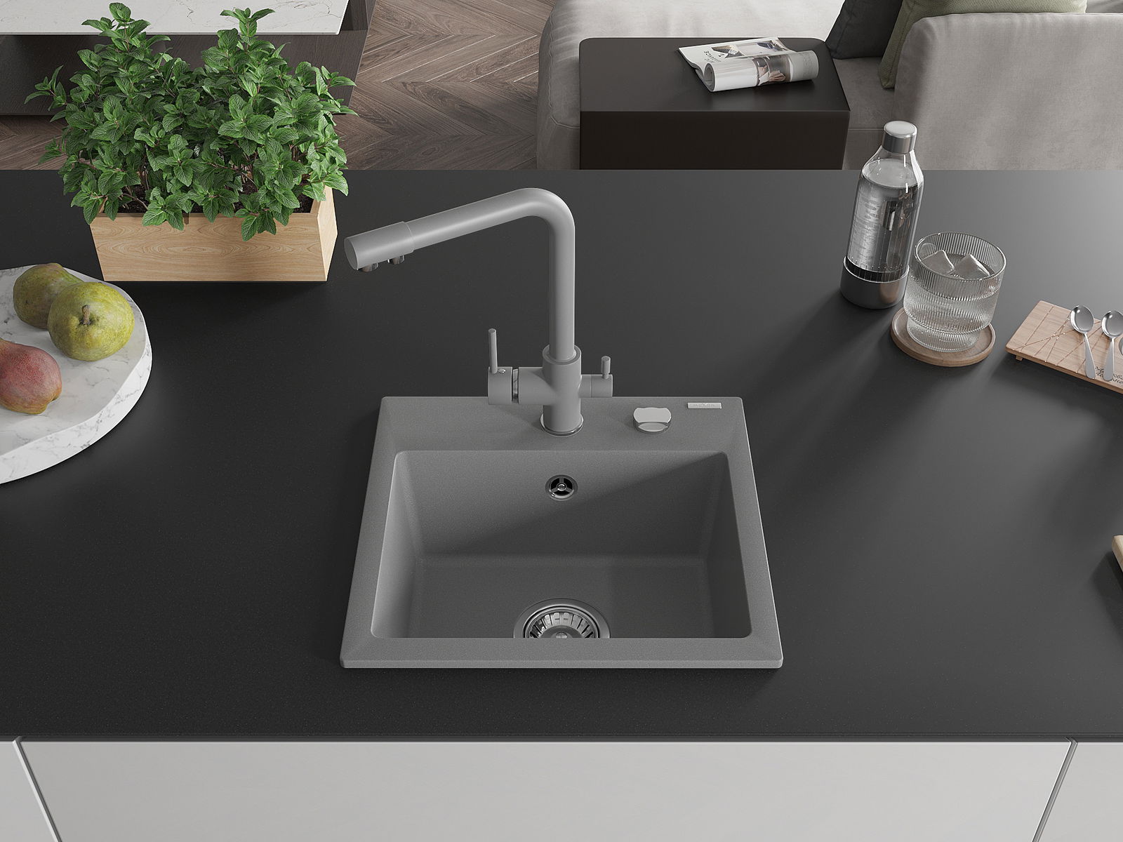 Mexen Milo chiuvetă de bucătărie din granit cu 1 compartiment și baterie Duero, gri - 6505-71-671600-71