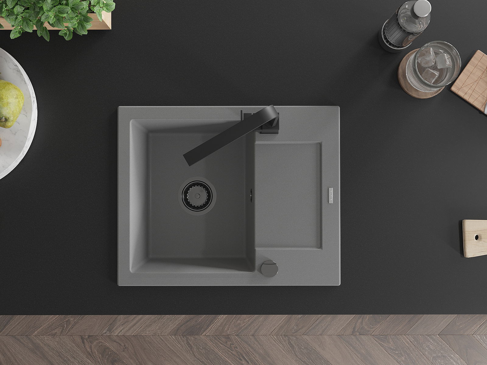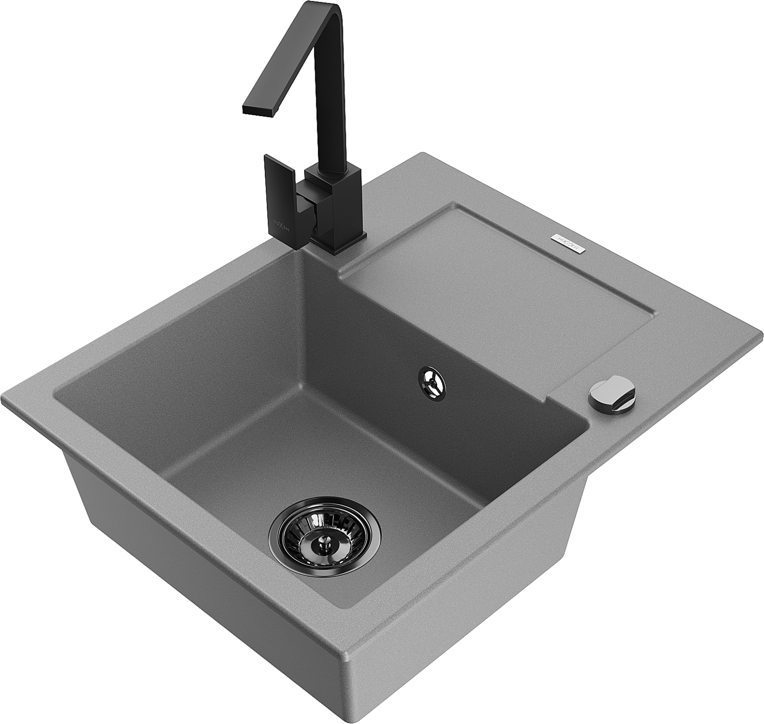 Mexen Enzo chiuvetă de granit cu 1 compartiment cu suport de scurgere și baterie de bucătărie Rita, gri - 6506-71-670300-70-B