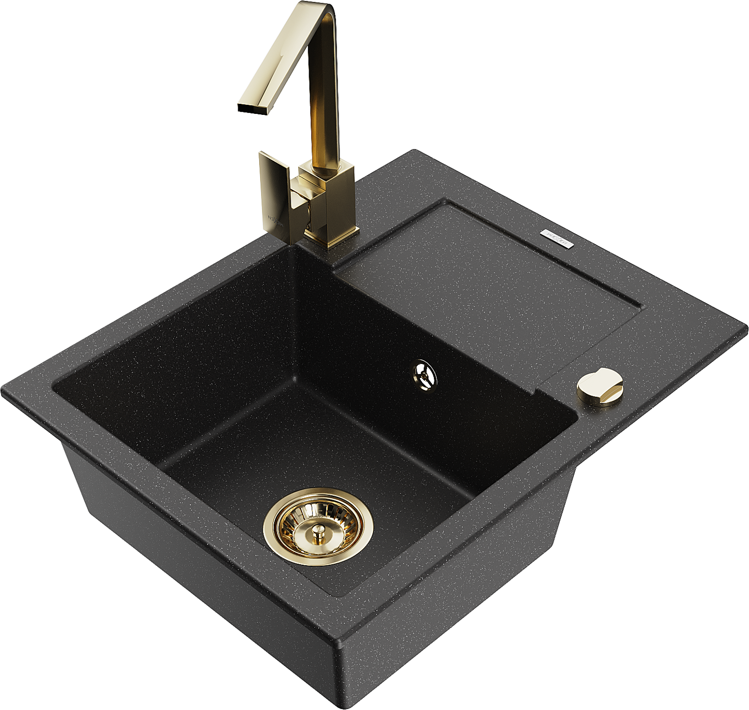 Mexen Enzo chiuvetă de granit cu o cuvă și scurgător, cu baterie de bucătărie Rita, negru/argintiu metalic