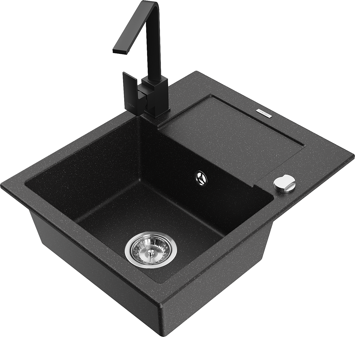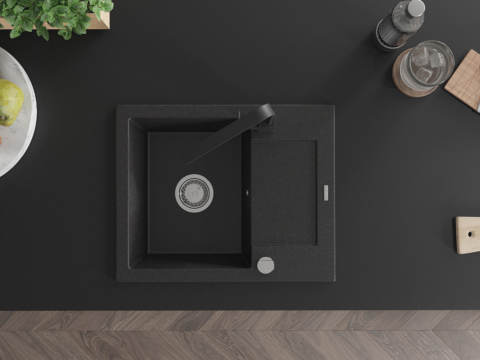 Mexen Enzo chiuvetă de granit cu o singură cuvă, cu scurgător și baterie de bucătărie Rita, negru/argintiu metalic