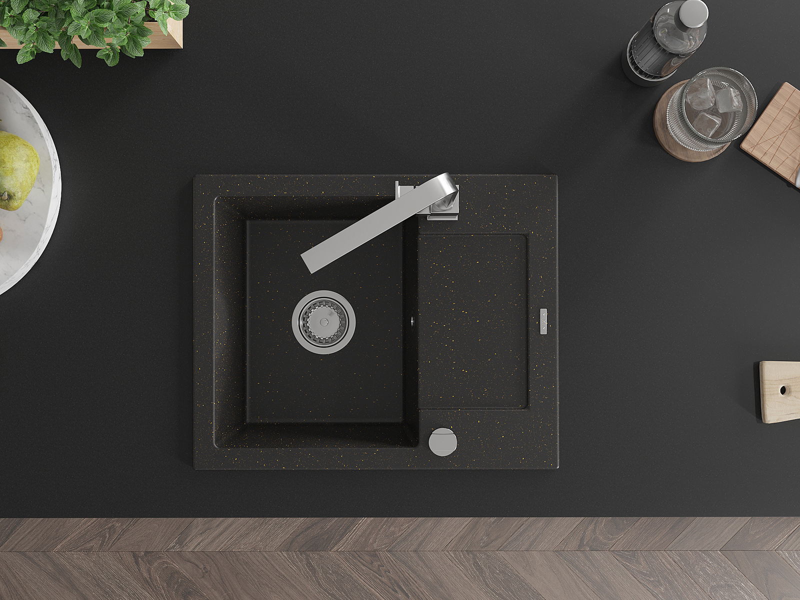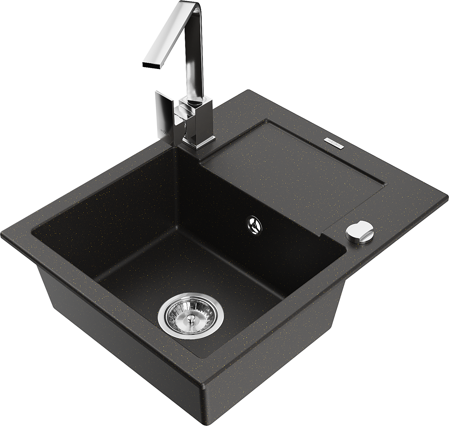 Mexen Enzo chiuvetă de bucătărie din granit cu 1 compartiment, cu scurgător și robinet de bucătărie Rita, negru/auriu