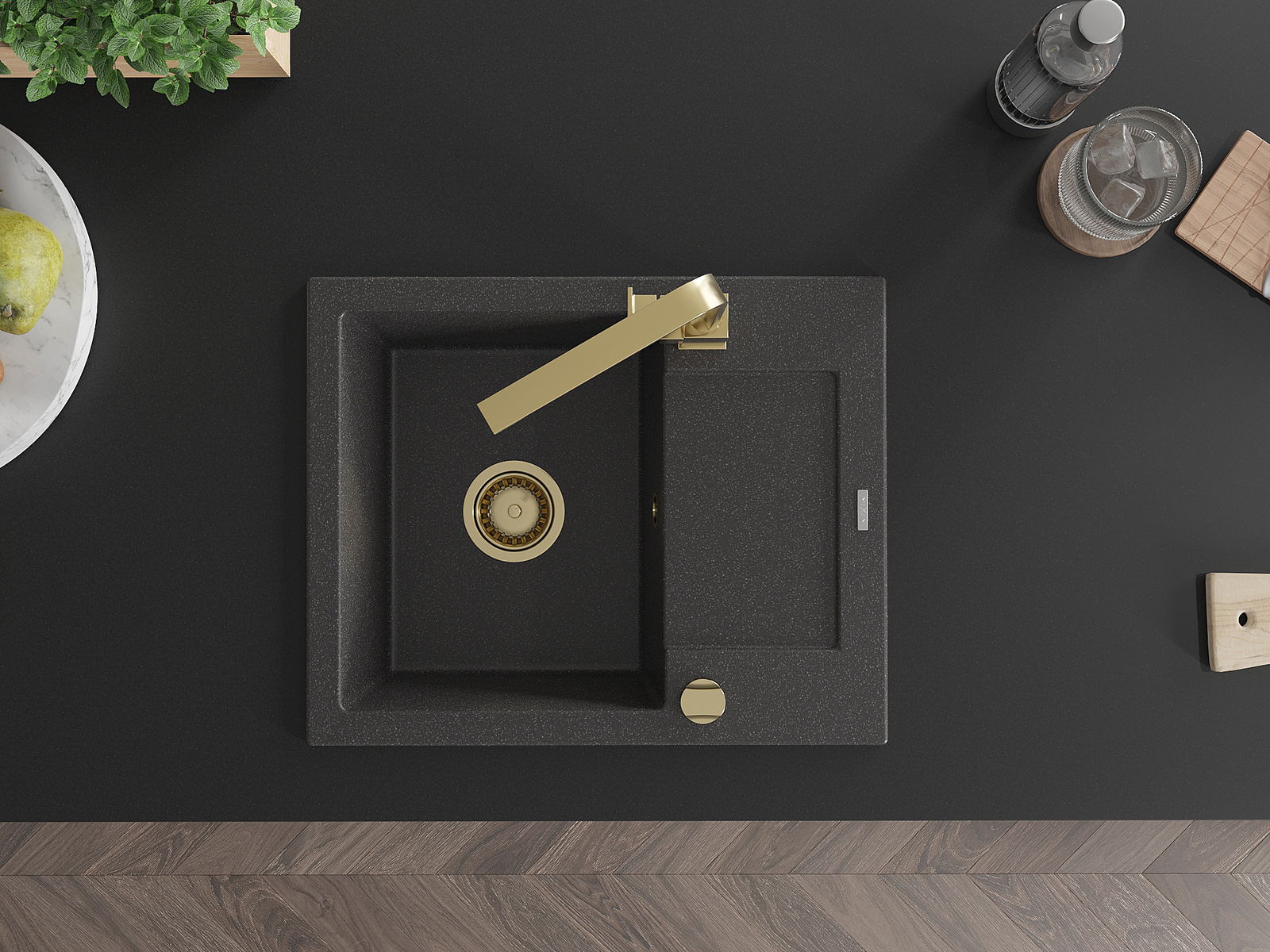 Mexen Enzo chiuvetă de bucătărie granit 1-cameră cu scurgator și baterie bucătărie Rita, negru cu puncte albe