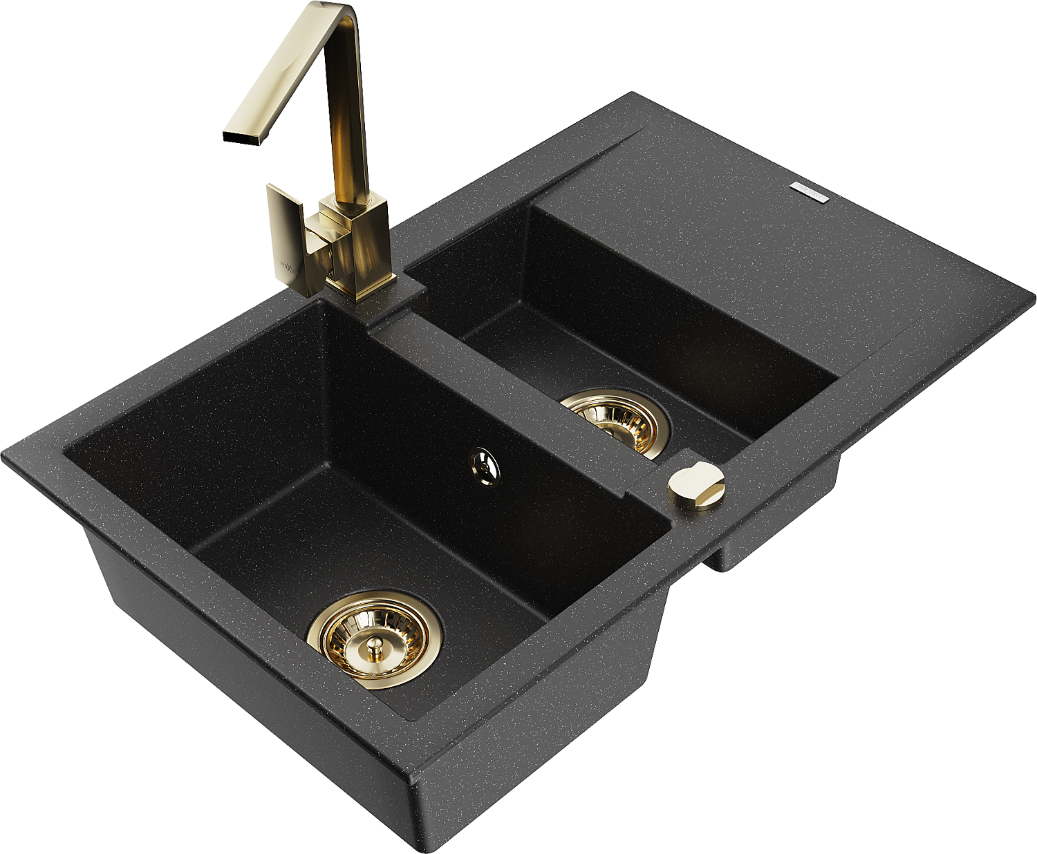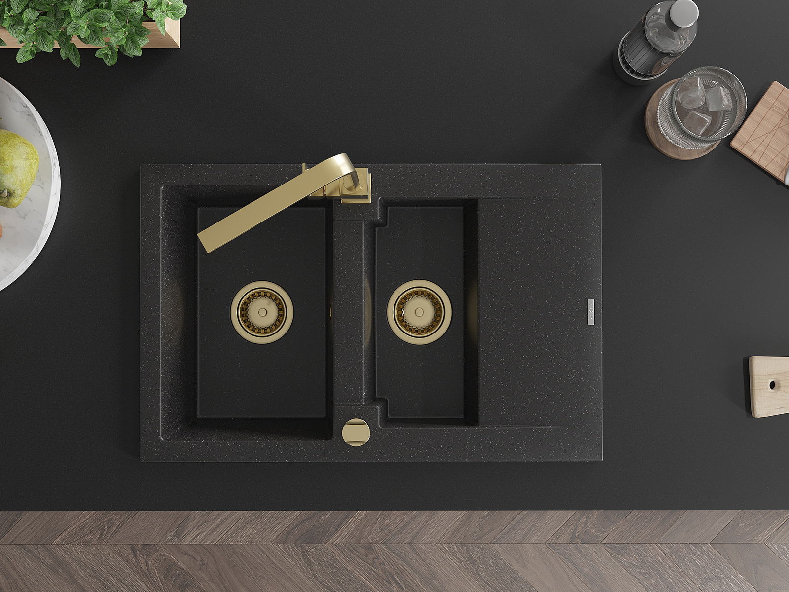 Mexen Gaspar chiuvetă din granit cu 1,5 compartimente cu scurgător și baterie de bucătărie Rita, negru/metalic argintiu