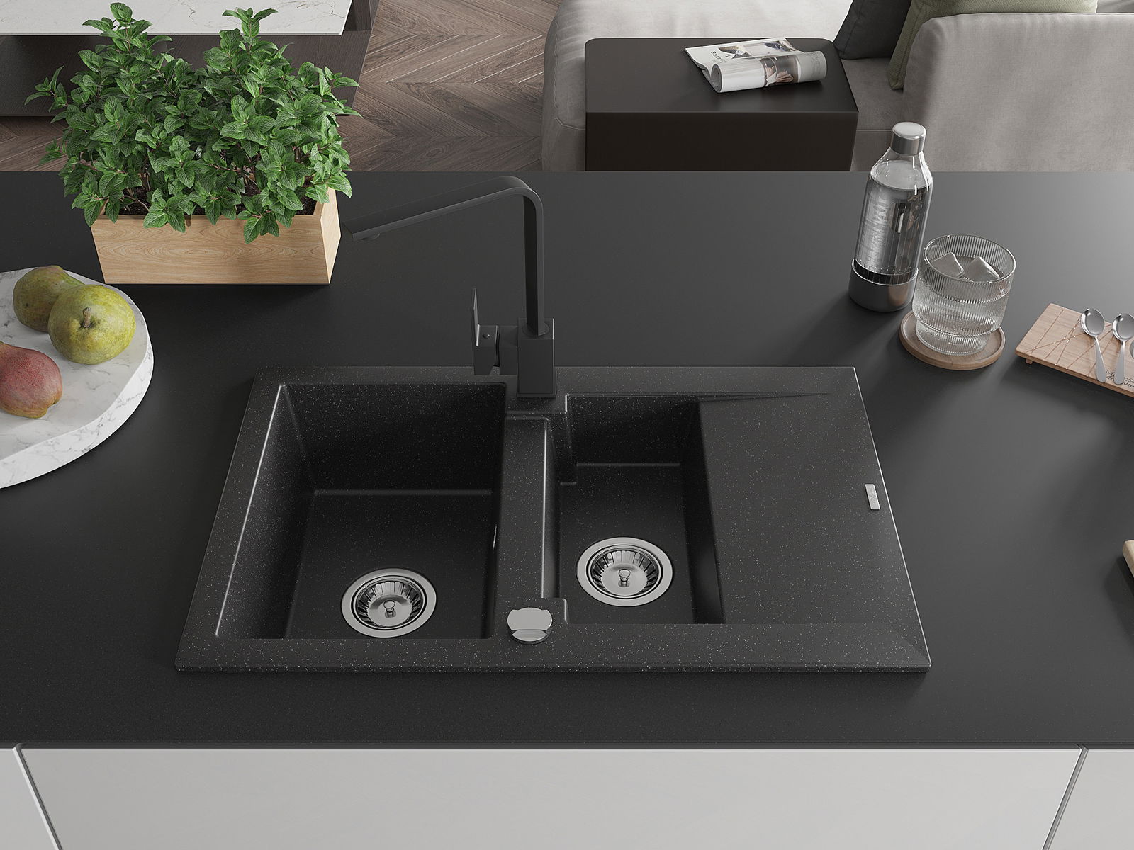 Mexen Gaspar chiuvetă din granit cu 1,5 compartimente cu scurgător și baterie de bucătărie Rita, negru/argintiu metalizat