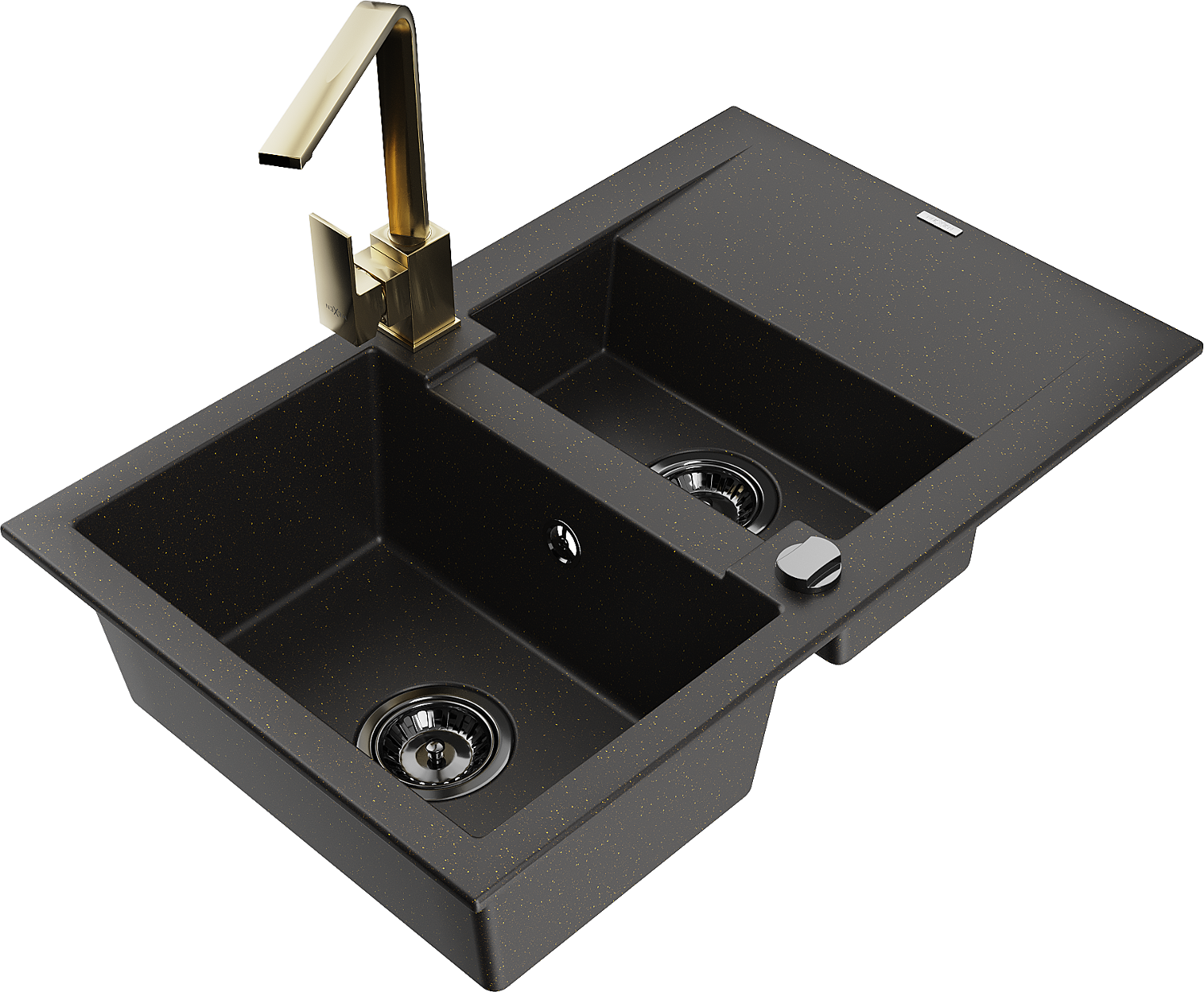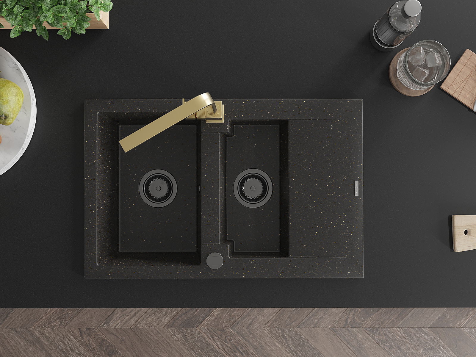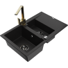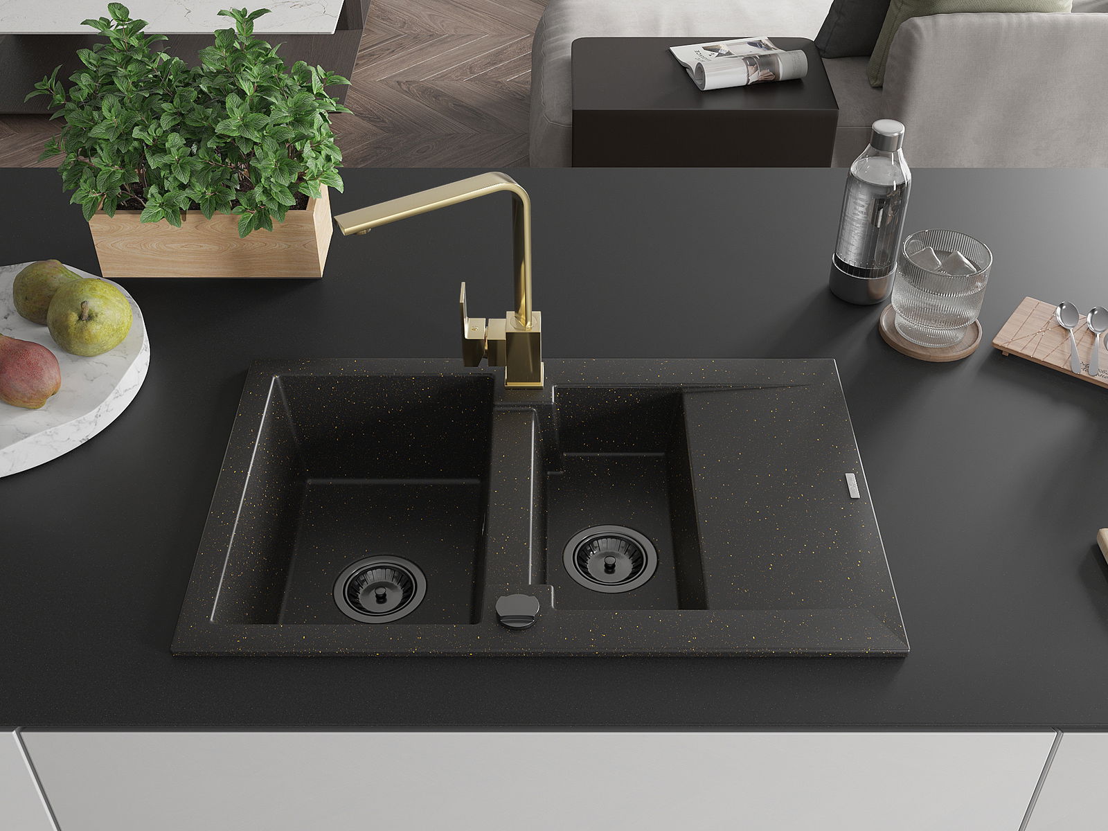 Mexen Gaspar chiuvetă de bucătărie din granit cu 1,5 cuve cu scurgător și baterie de bucătărie Rita, negru/auriu