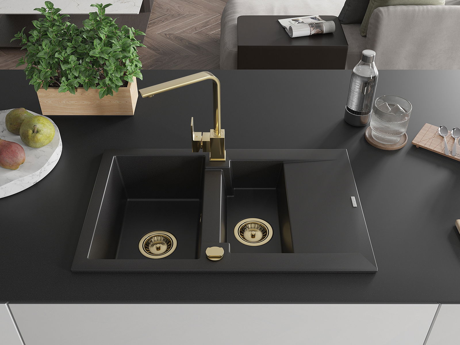 Mexen Gaspar chiuvetă din granit 1,5 camere cu scurgător și baterie de bucătărie Rita, negru - 6507-77-670300-50