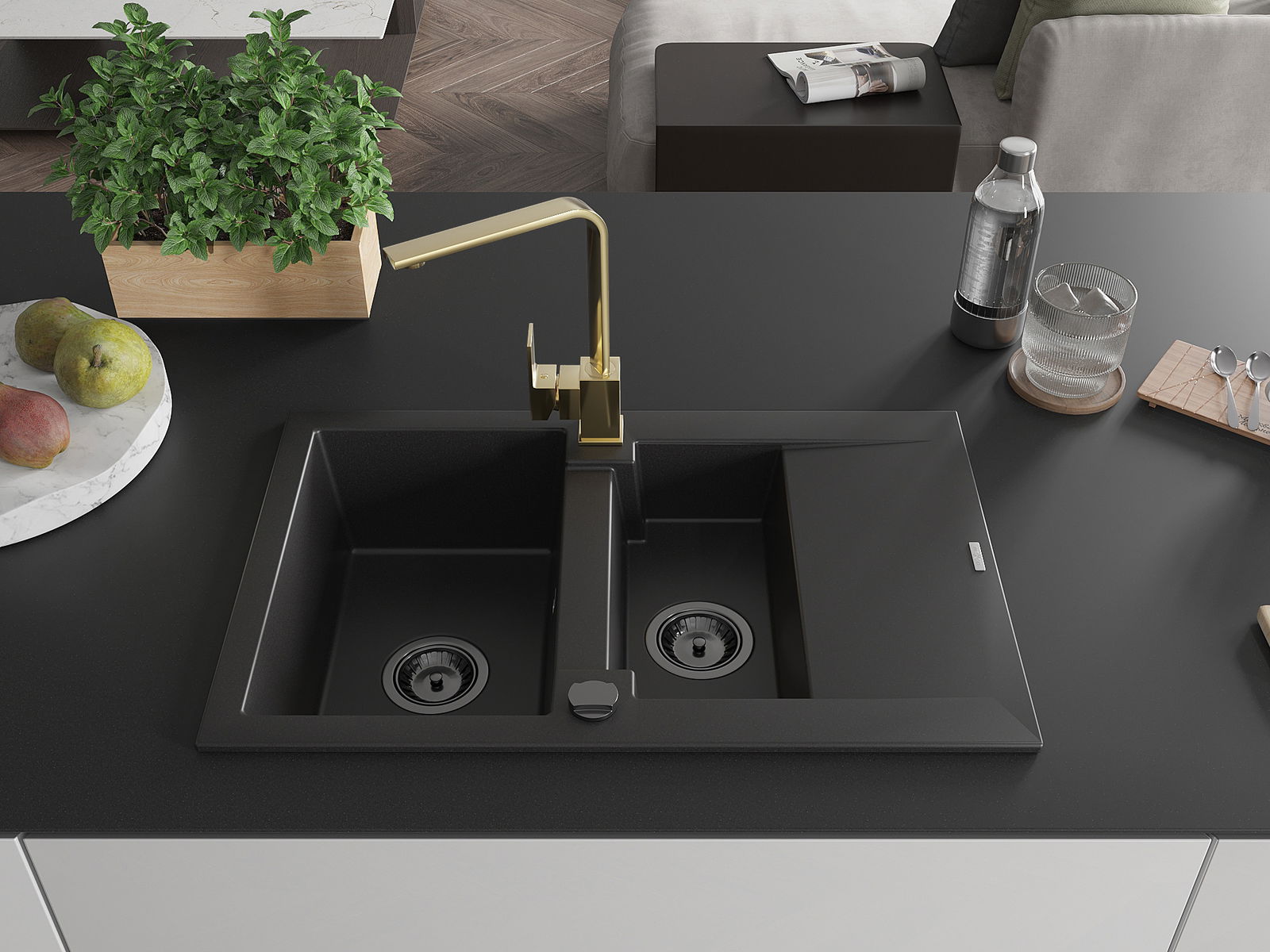 Mexen Gaspar chiuvetă din granit cu 1,5 compartimente, cu scurgător și baterie de bucătărie Rita, negru - 6507-77-670300-50-B