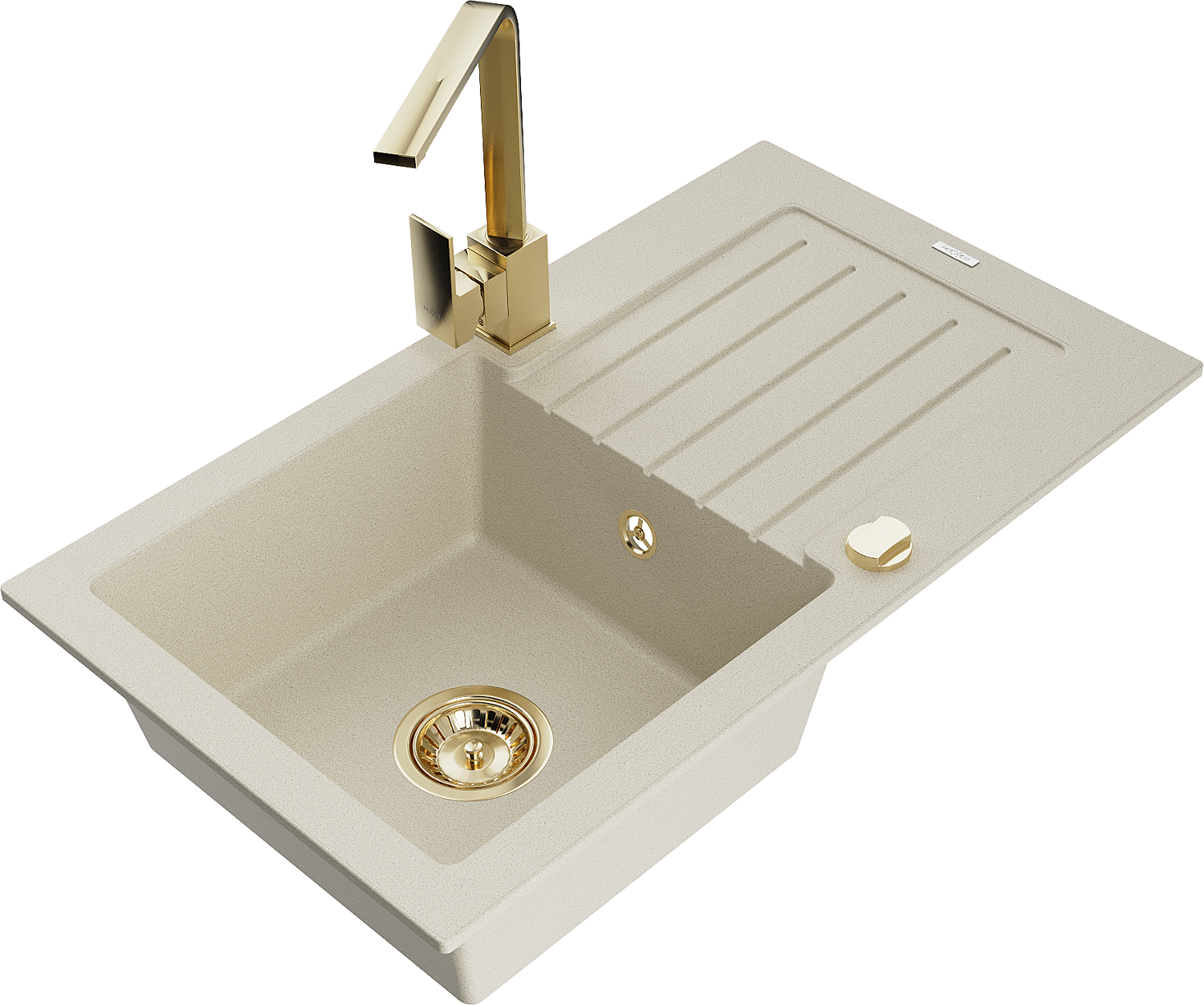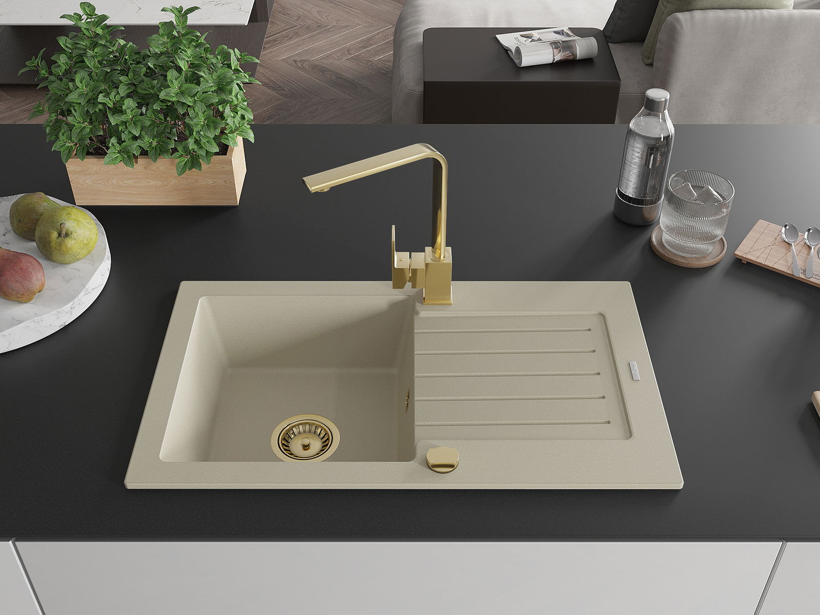 Mexen Pablo chiuvetă din granit cu 1 compartiment cu picurător și baterie de bucătărie Rita, bej - 6510-69-670300-50