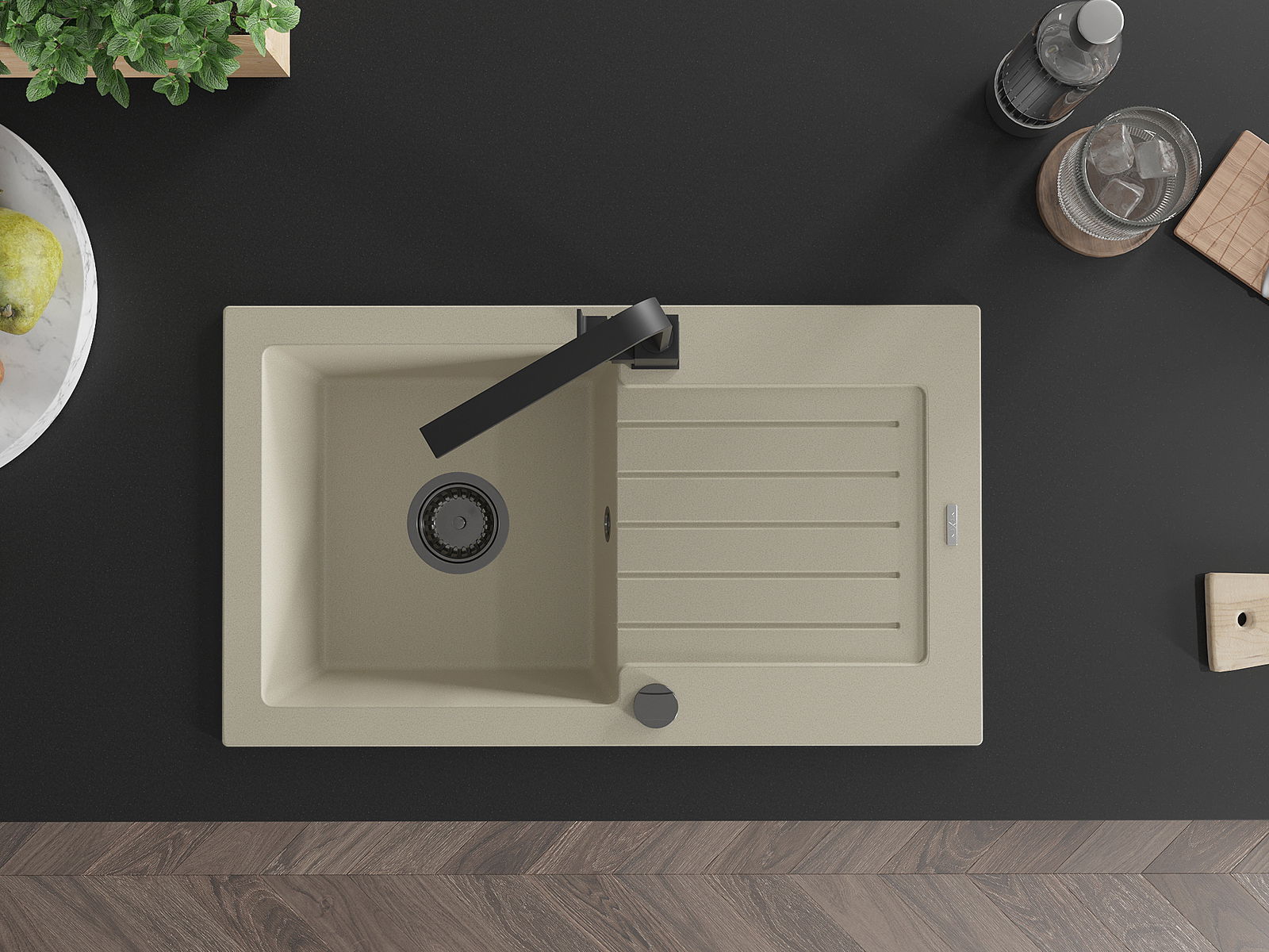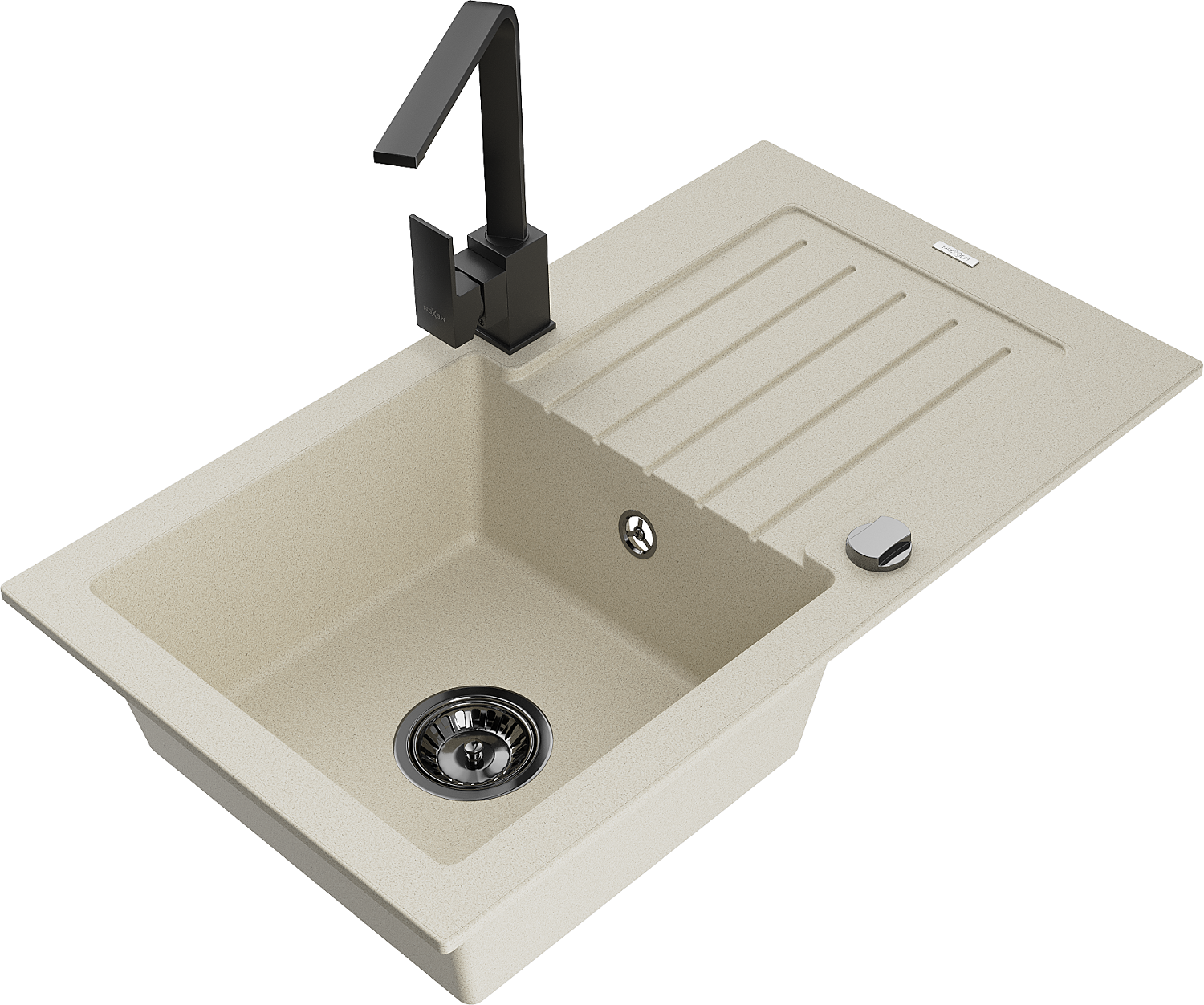 Mexen Pablo chiuvetă granitică cu 1 cuvă, cu scurgător și baterie de bucătărie Rita, bej - 6510-69-670300-70
