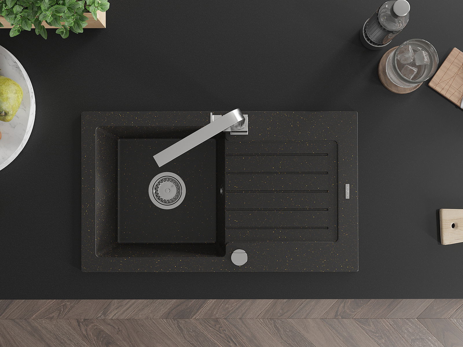 Mexen Pablo chiuvetă granit 1 compartiment cu scurgător și baterie bucătărie Rita, negru/auriu metalic- 6510-75-670300-00