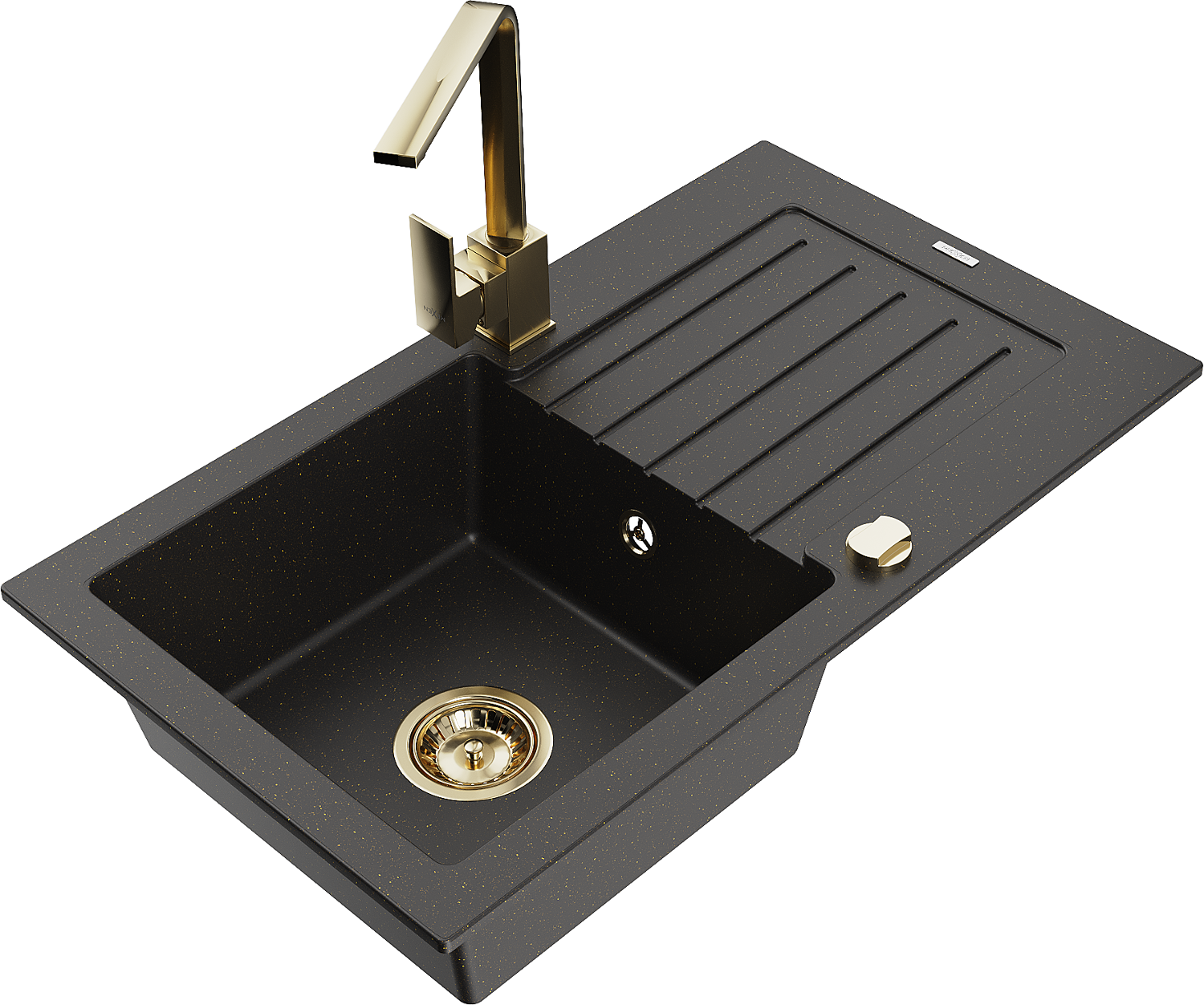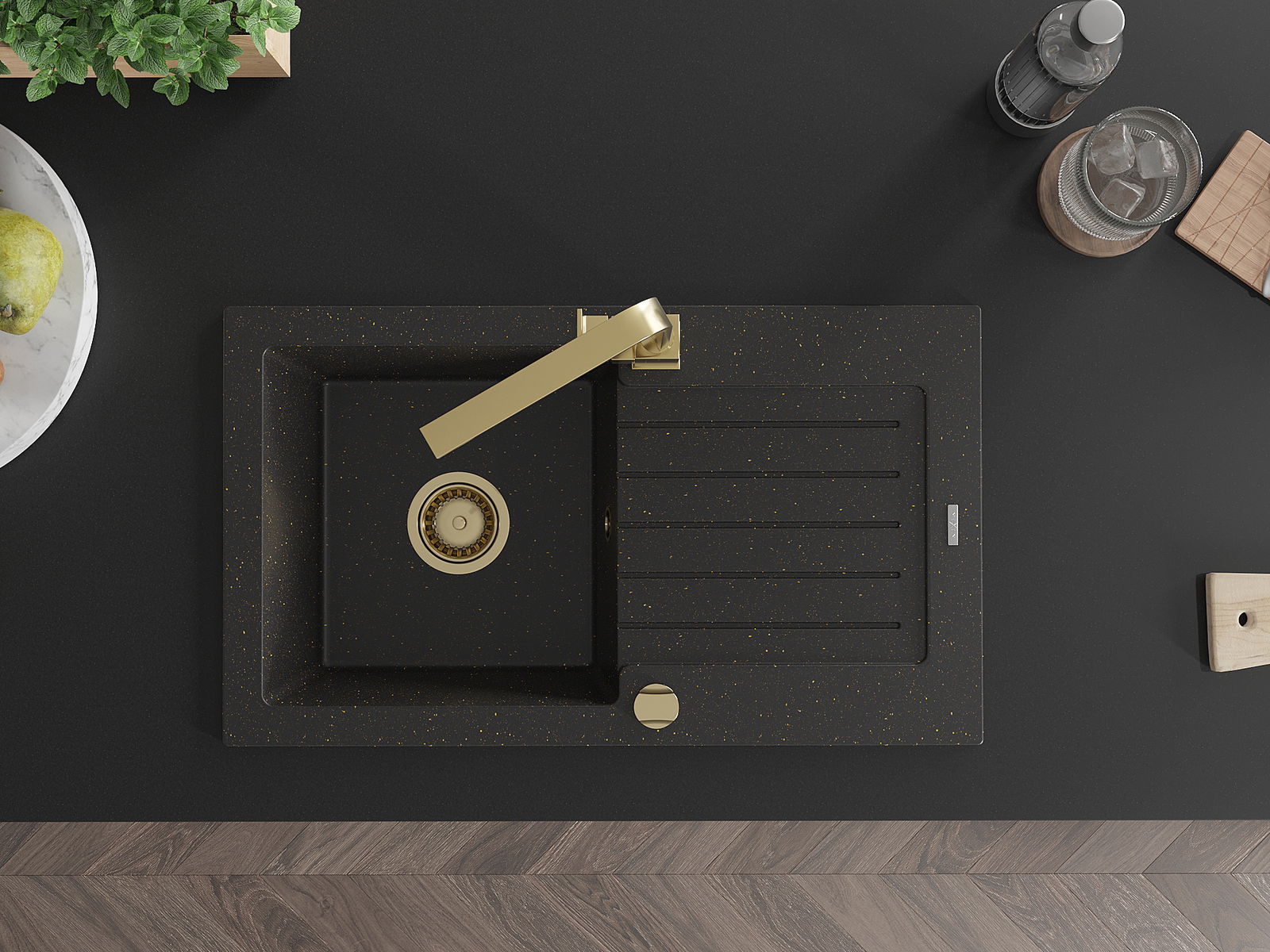 Mexen Pablo chiuvetă de granit cu 1 cuvă cu scurgător și baterie de bucătărie Rita, negru/auriu metalic- 6510-75-670300-50