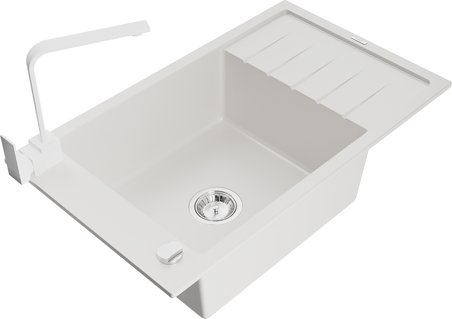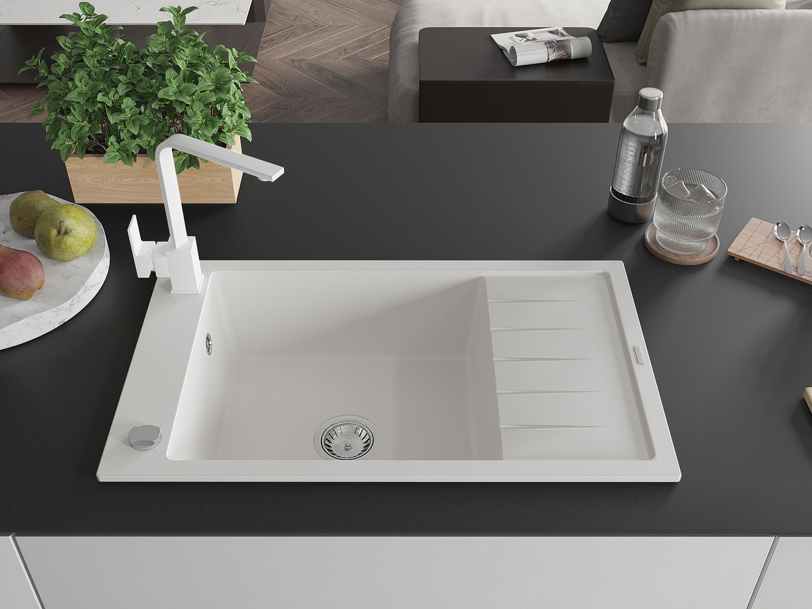 Mexen Elias chiuvetă de bucătărie din granit cu 1 cuvă cu scurgător și baterie de bucătărie Rita, alb - 6511-20-670300-20