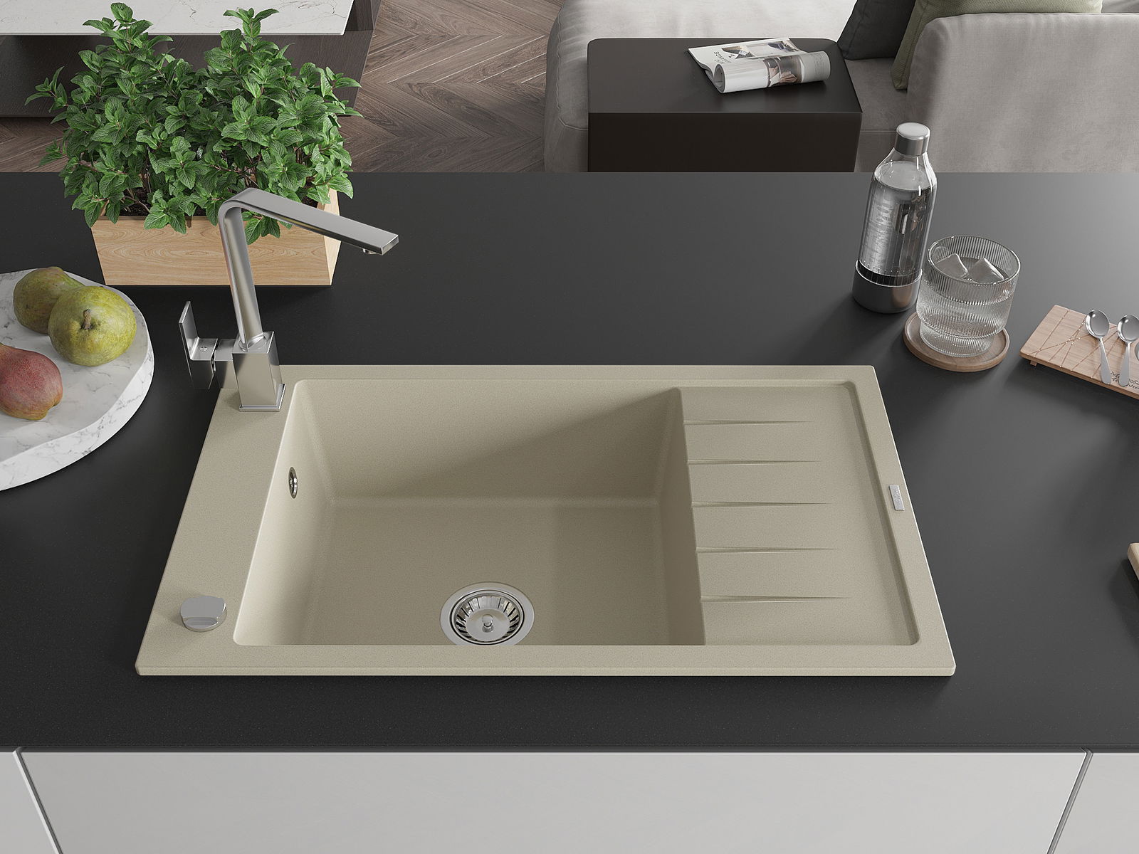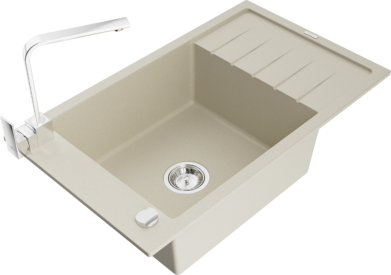 Mexen Elias chiuvetă de granit cu o singură cuvă cu picurător și baterie de bucătărie Rita, bej - 6511-69-670300-00