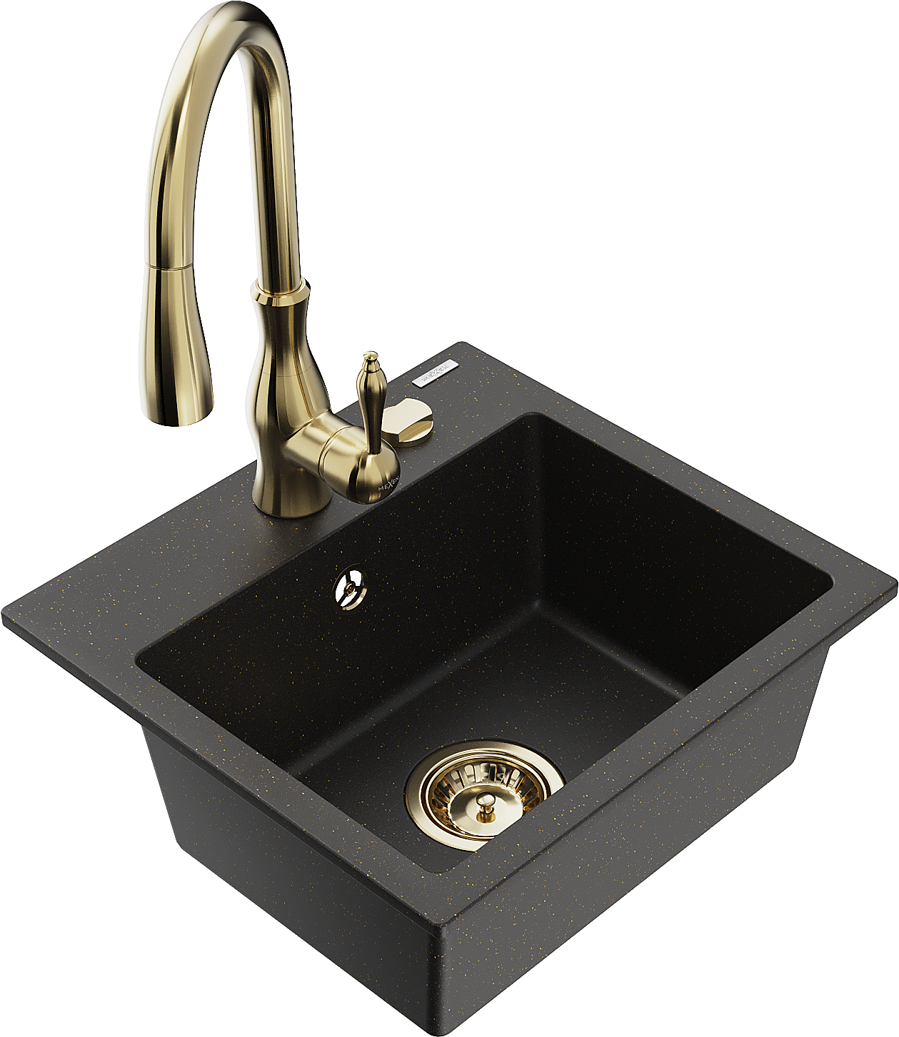 Mexen Milo chiuvetă de bucătărie din granit cu 1 compartiment și baterie de bucătărie Savita, negru/auriu metalizat- 6505-75-67?