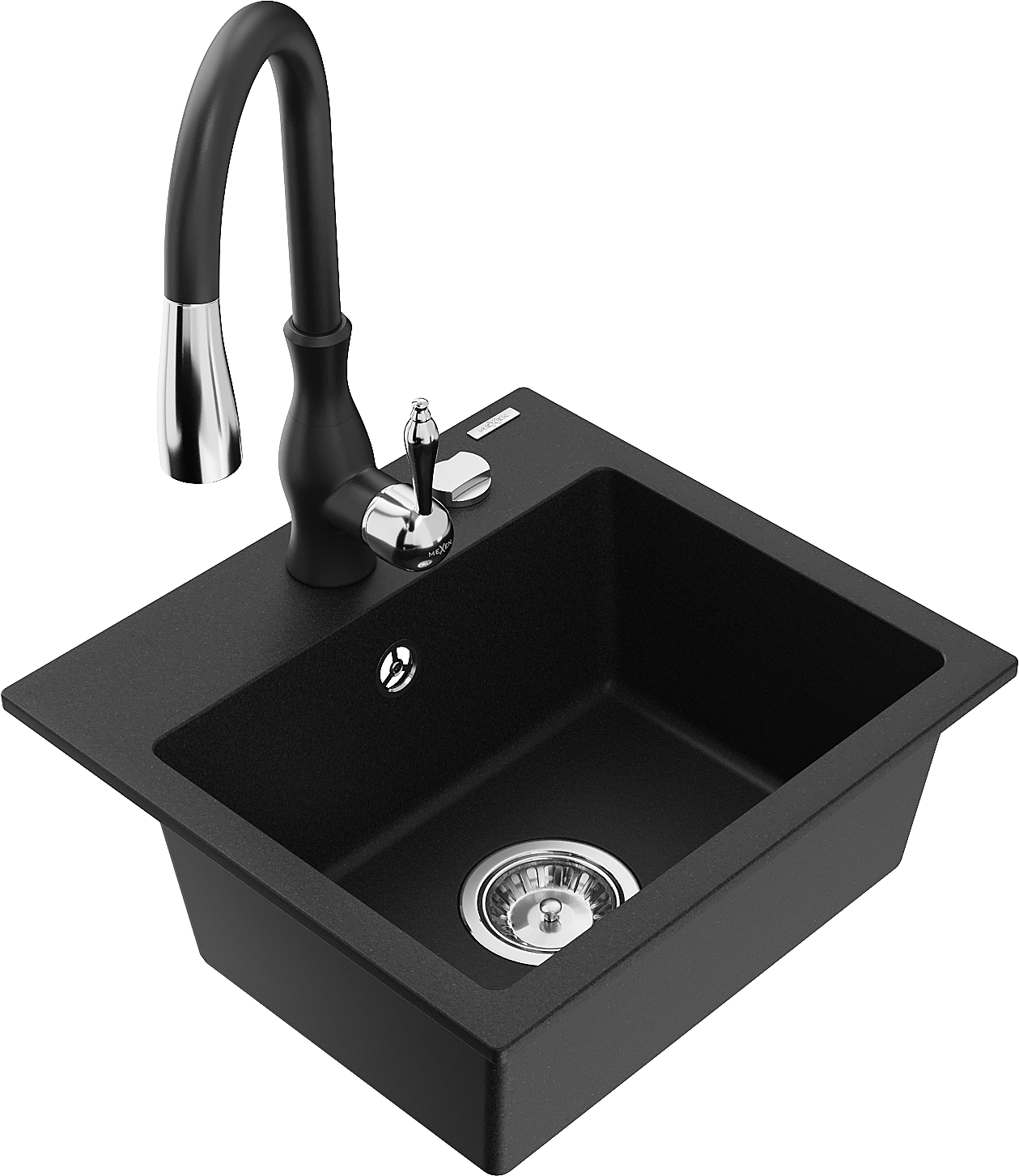 Mexen Milo chiuvetă de bucătărie din granit cu 1 compartiment și baterie de bucătărie Savita, negru - 6505-77-672601-70