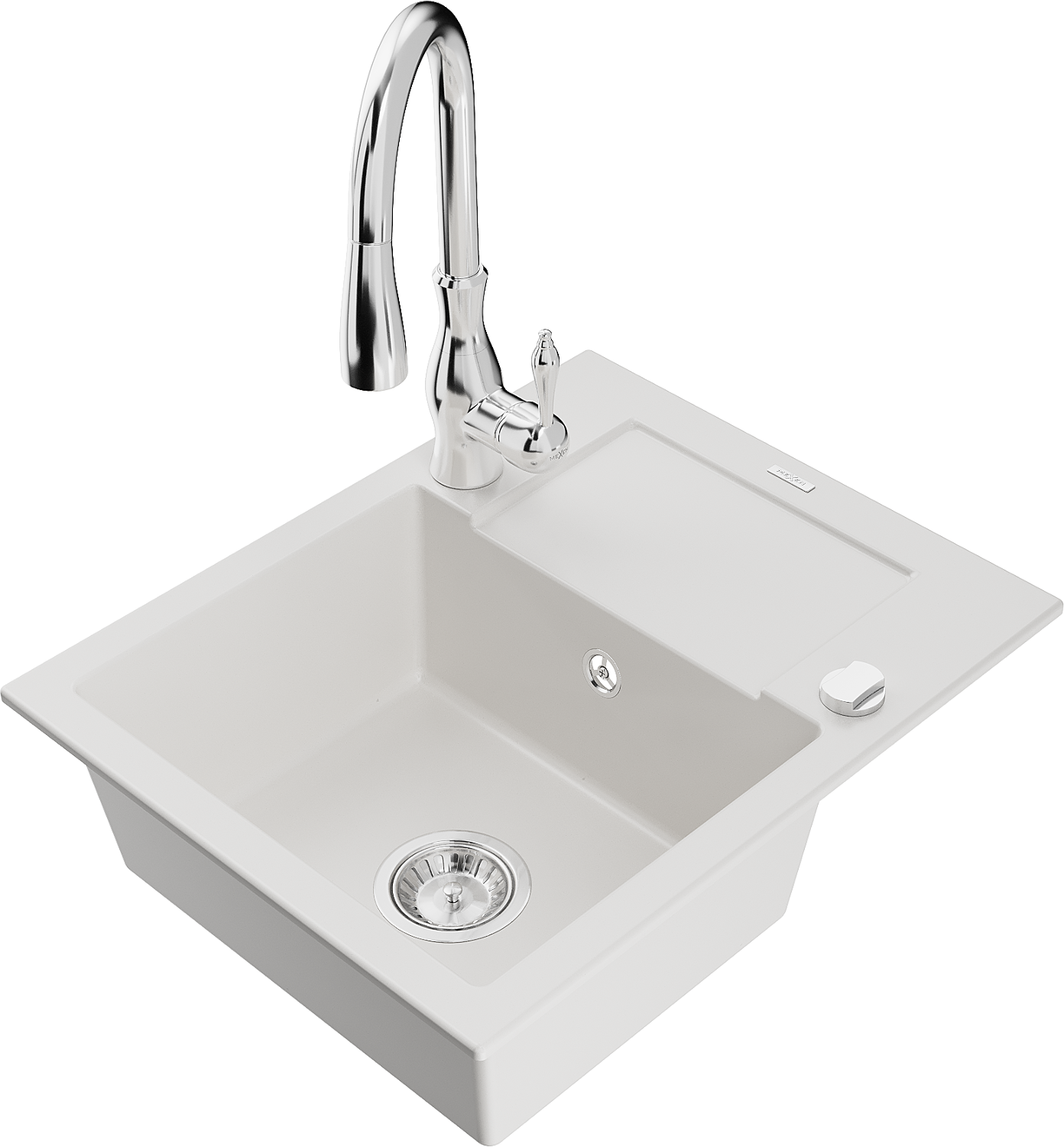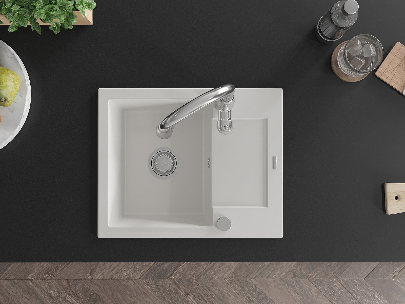 Mexen Enzo chiuvetă de granit cu 1 cuvă, cu scurgător și baterie de bucătărie Savita, alb - 6506-20-672601-00