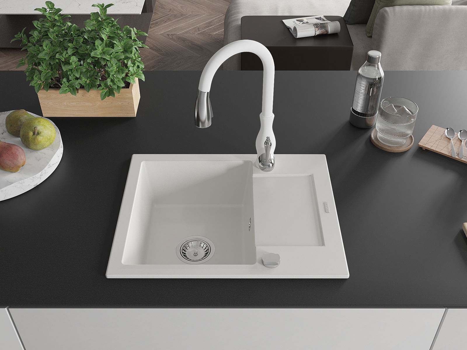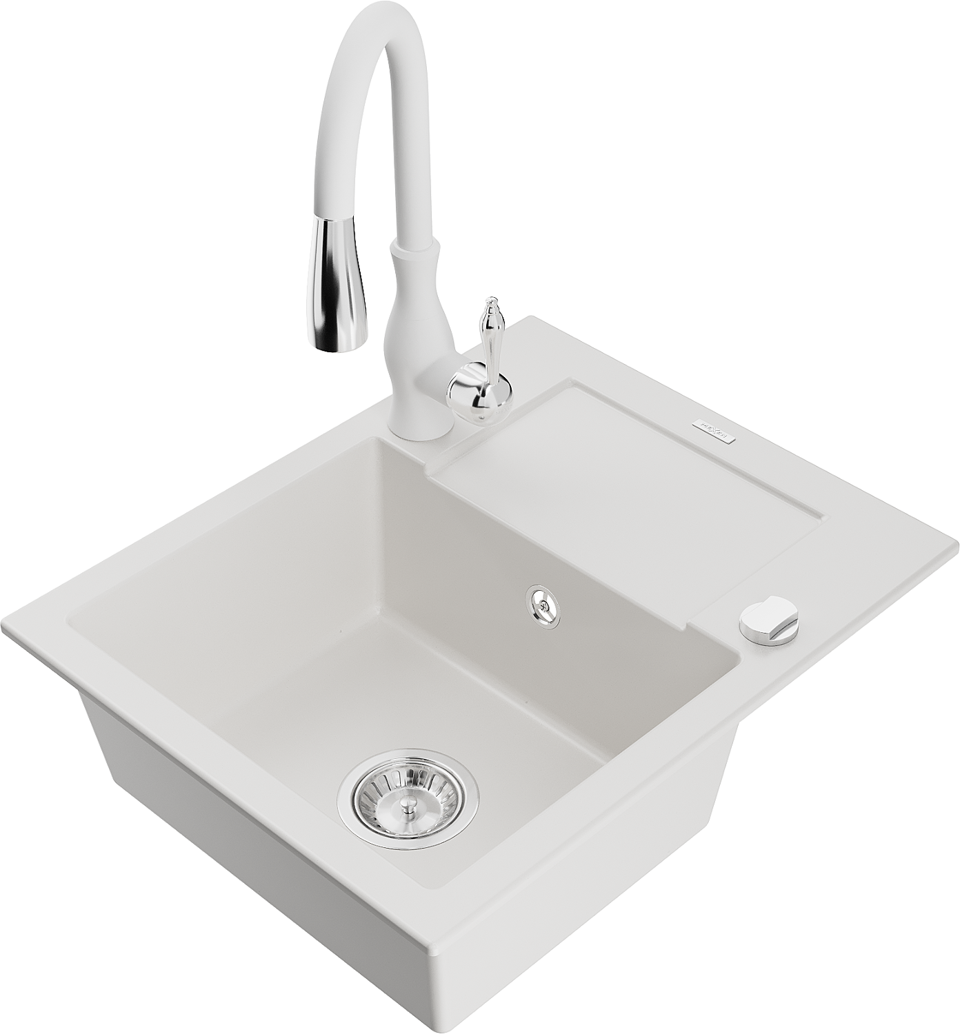 Mexen Enzo chiuvetă de granit cu 1 compartiment și picurător și baterie de bucătărie Savita, alb - 6506-20-672601-20