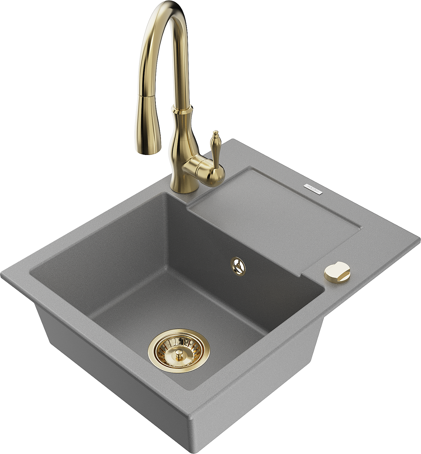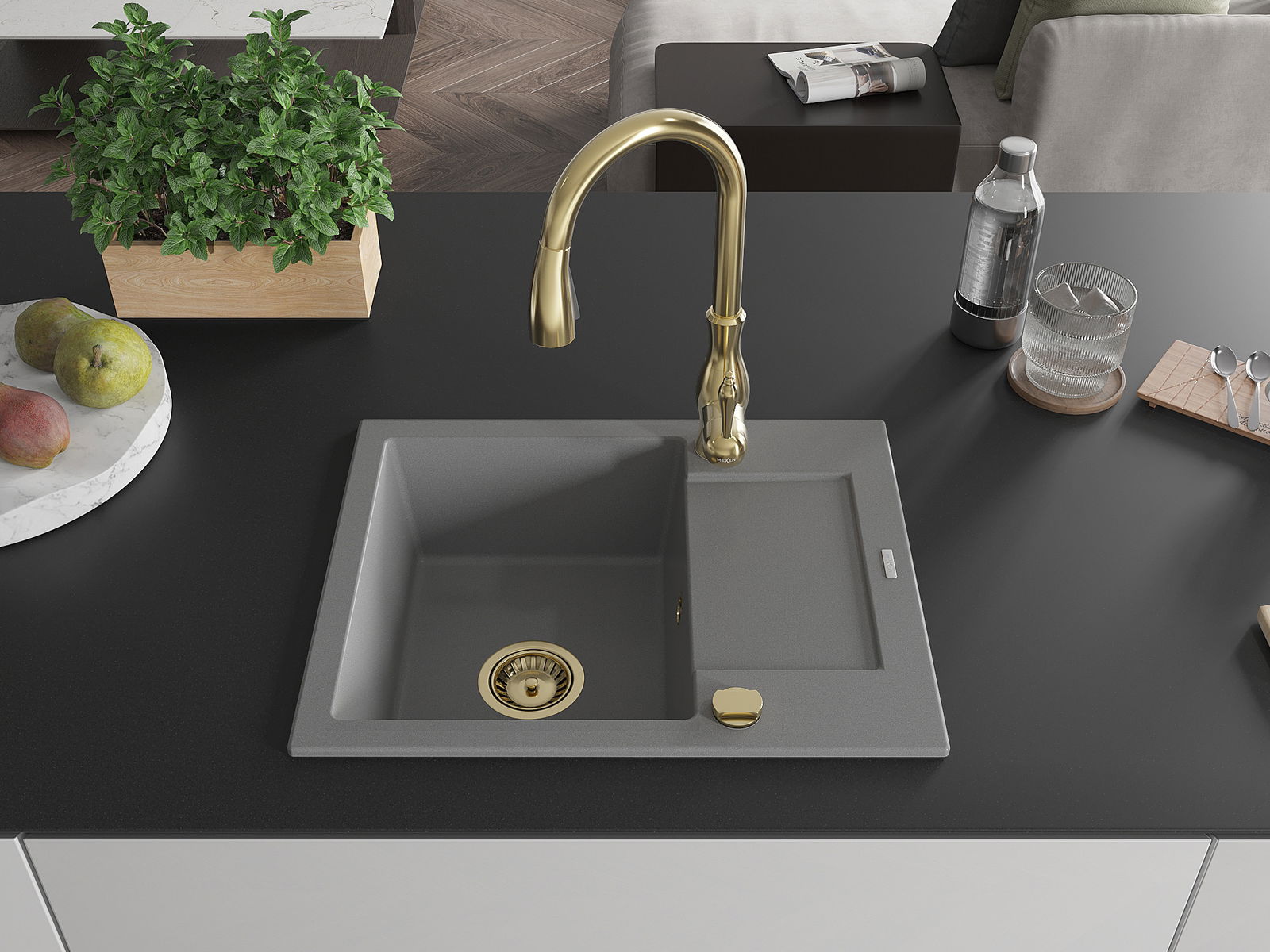 Mexen Enzo chiuvetă de granit cu 1 compartiment cu scurgător și baterie de bucătărie Savita, gri - 6506-71-672601-50
