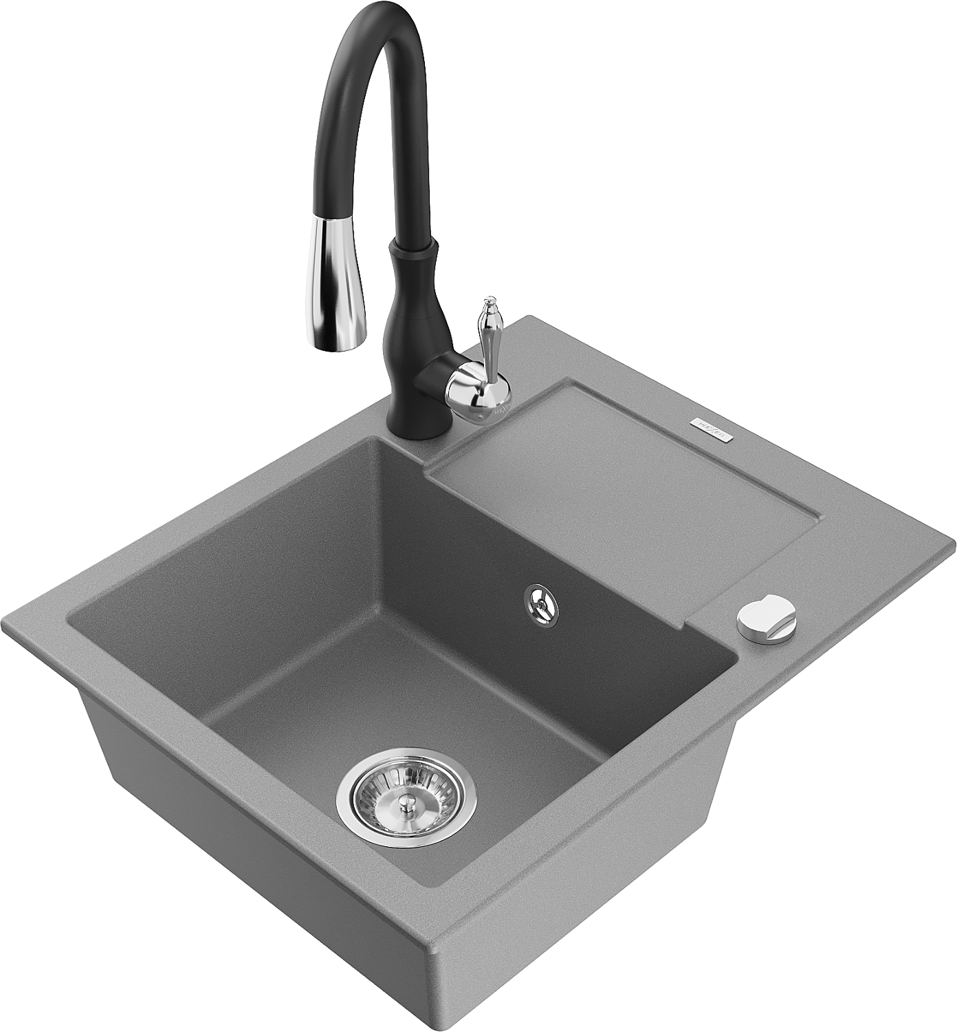 Mexen Enzo chiuvetă de bucătărie din granit cu 1 compartiment și picurător și baterie Savita, gri - 6506-71-672601-70