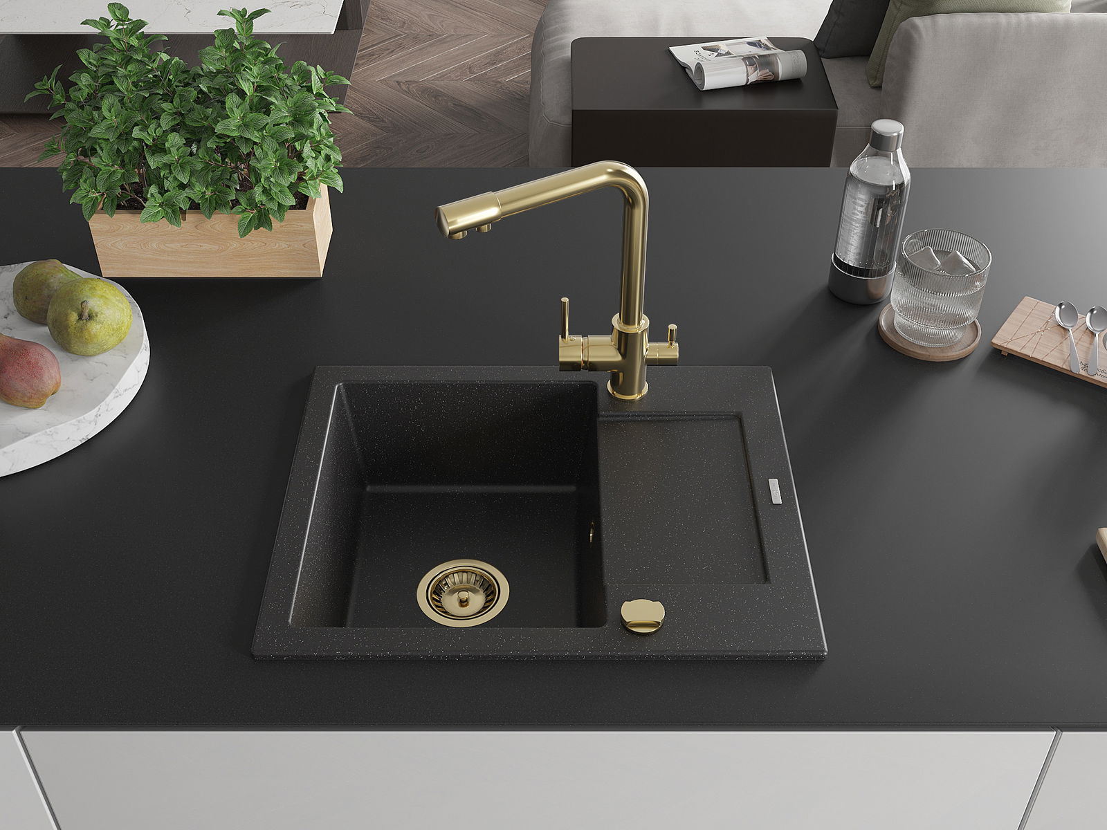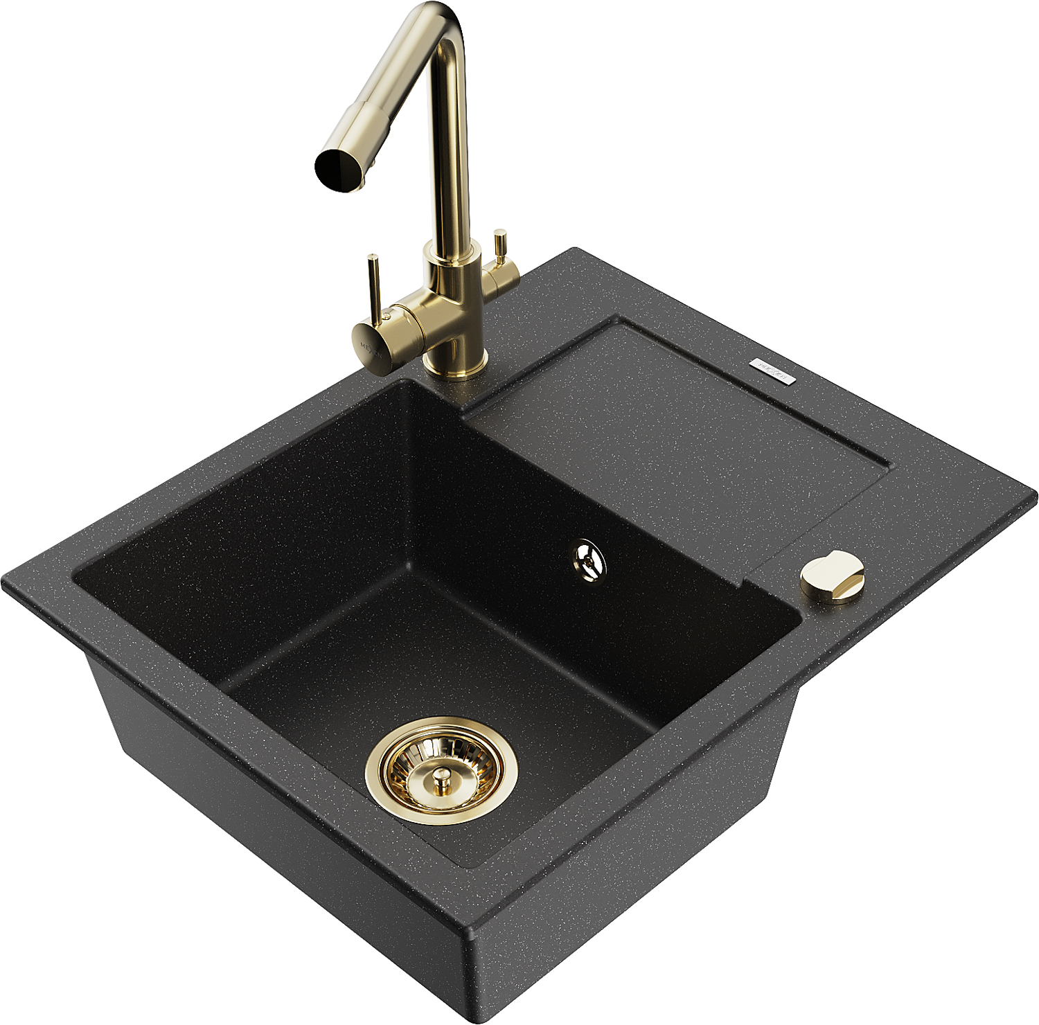 Mexen Enzo chiuvetă de granit cu o cuvă și scurgător și baterie de bucătărie Duero, negru/metalic argintiu