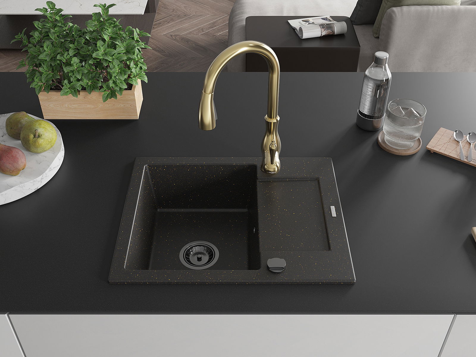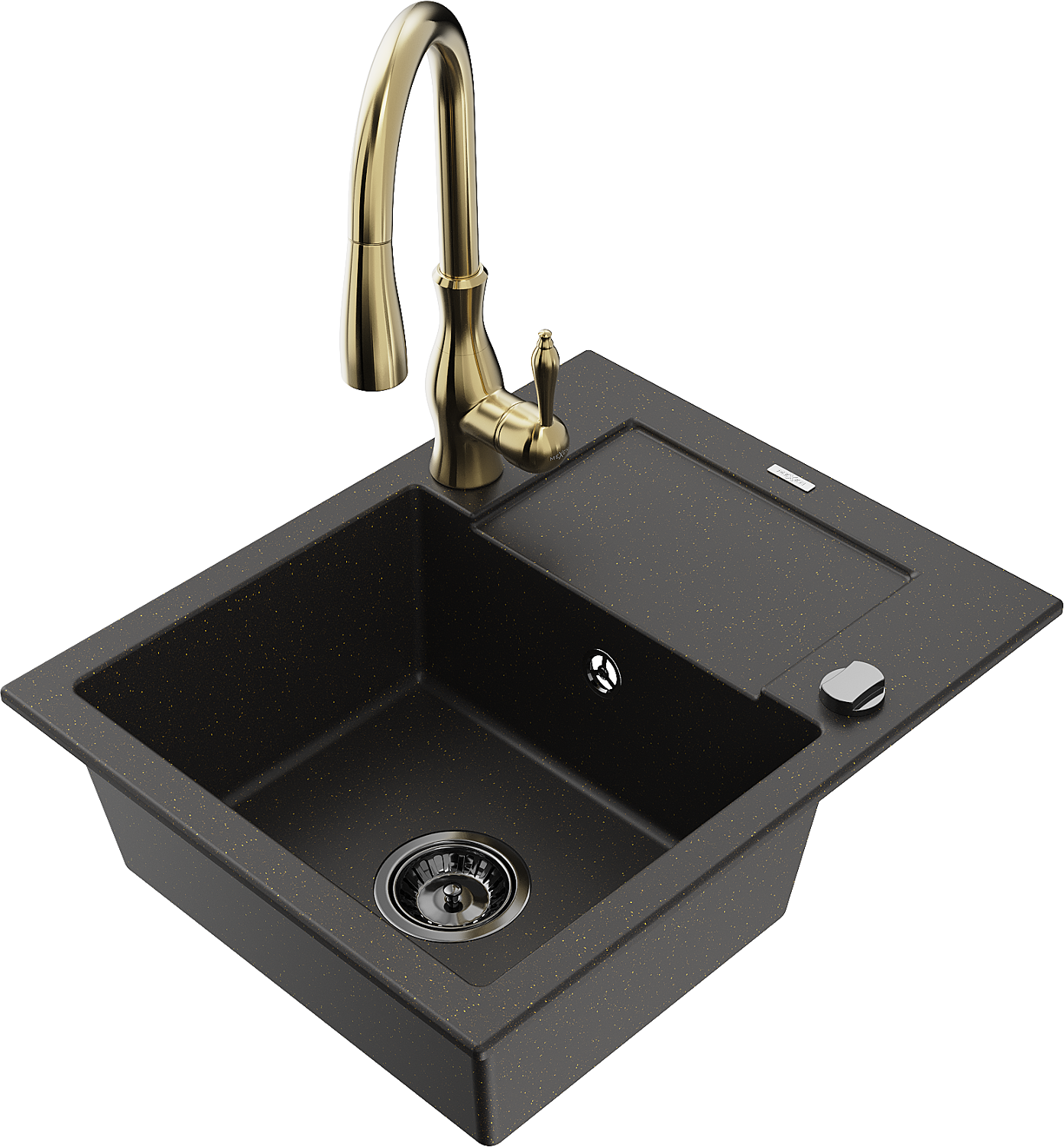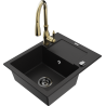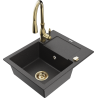 Mexen Enzo chiuvetă de bucătărie din granit cu 1 compartiment, cu scurgător și baterie de bucătărie Savita, negru/auriu