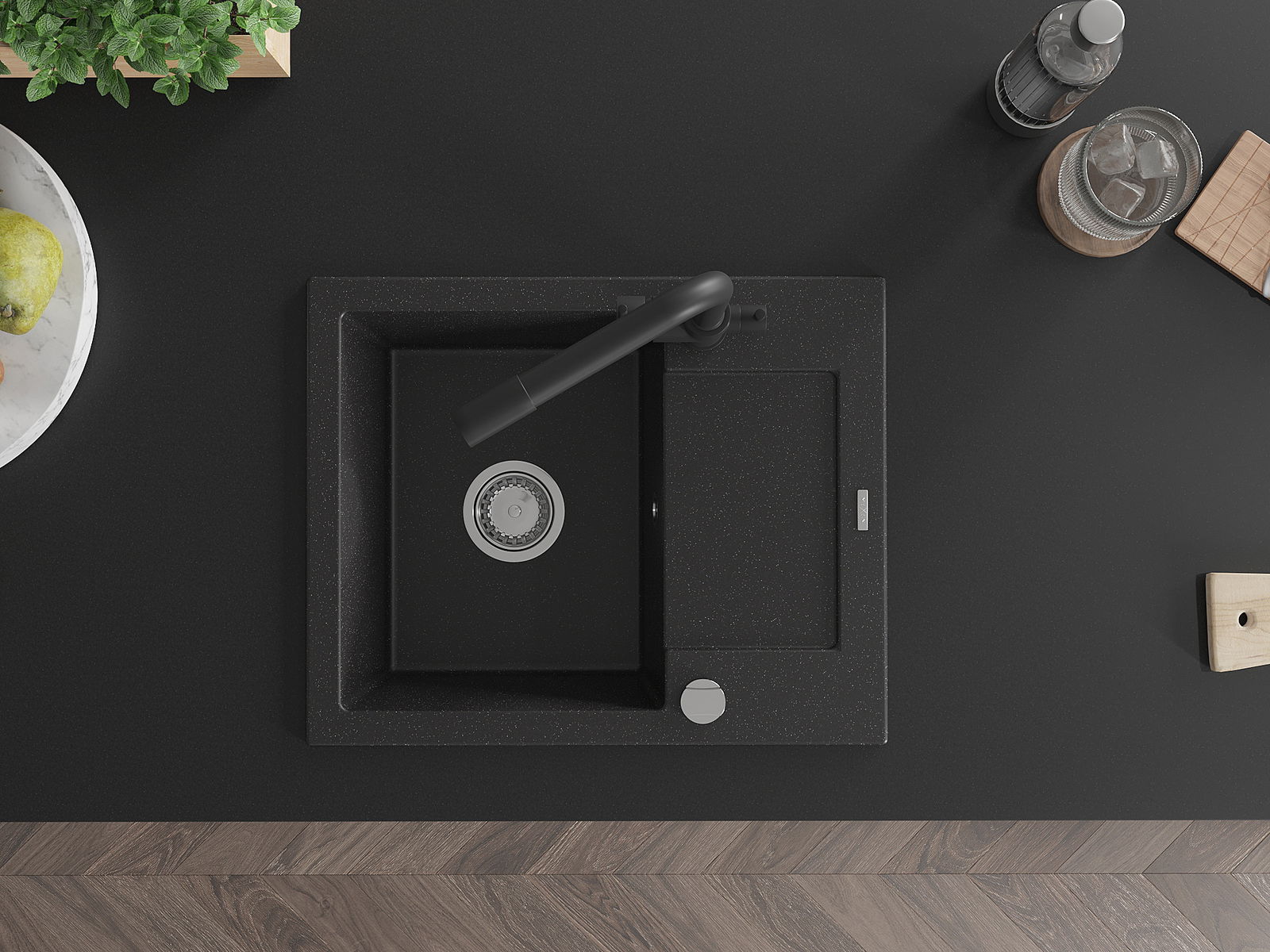 Mexen Enzo chiuvetă de granit cu 1 compartiment cu scurgător și baterie de bucătărie Duero, negru/argintiu metalizat